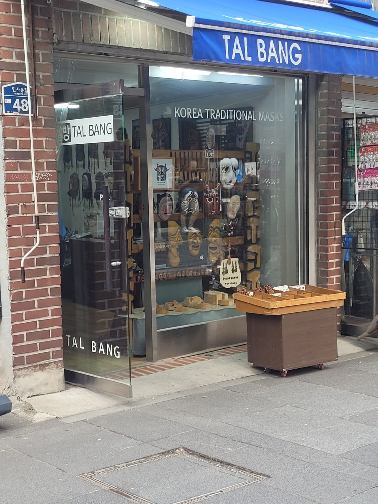 There really is only one main street through Insadong and that itself has smaller offshoots, all of which are worth looking down as you never know what you may find. I personally spent a good couple of hours wandering very slowly and checking out many windows on this street. The main items on offer here are: stationary/calligraphy supplies (proper looking professional stuff that you really need to know what you are seeking or asking for), silk crafts (pillows, bags, pillow cases, norigae – these are the traditional adornments you see on hanbok), dojang makers (these are the traditional name stamps used for documents), tal/hahoe masks (traditional wooden face masks used in rituals/plays/festivals) and art galleries (both traditional and modern-style art).