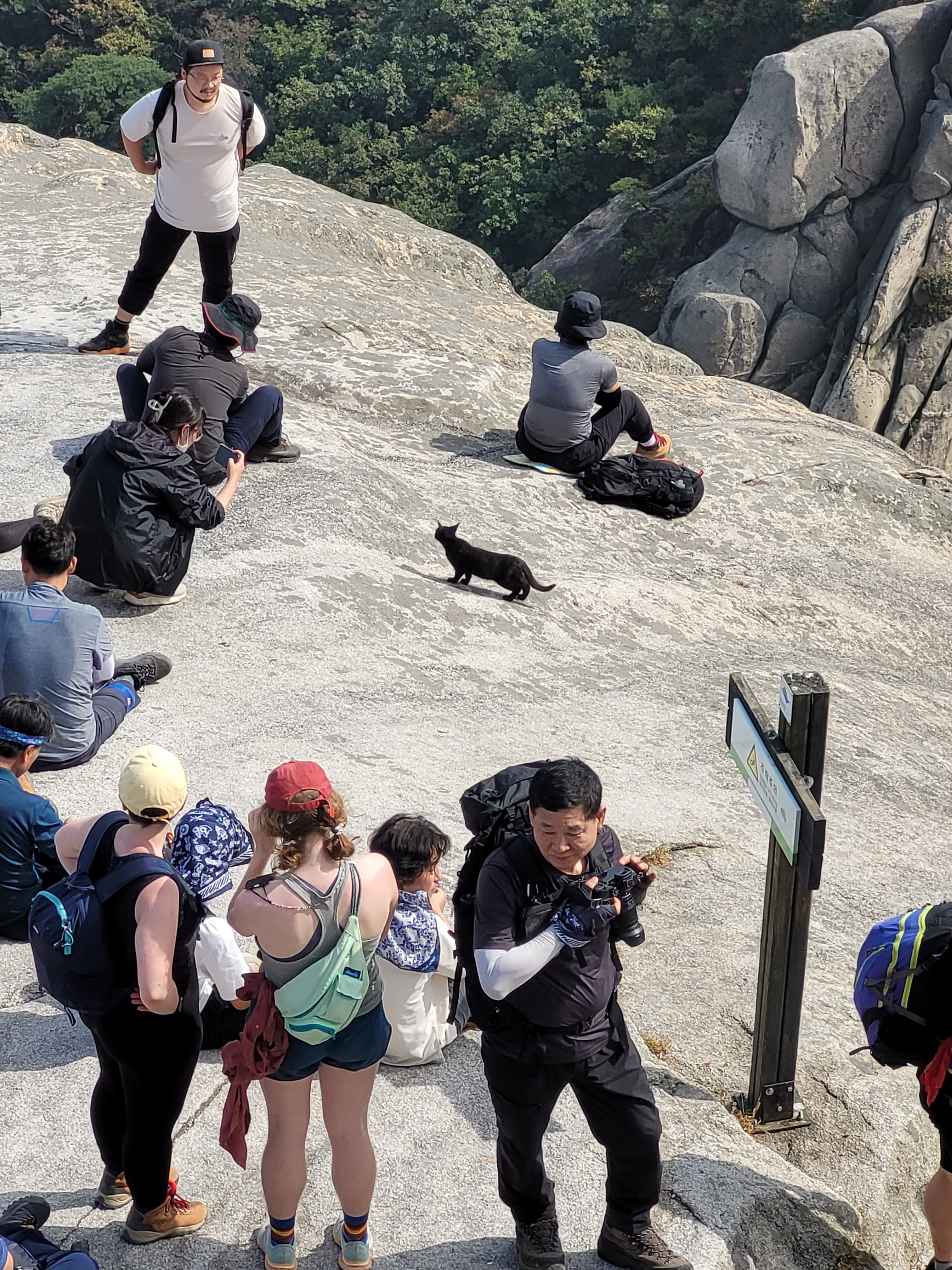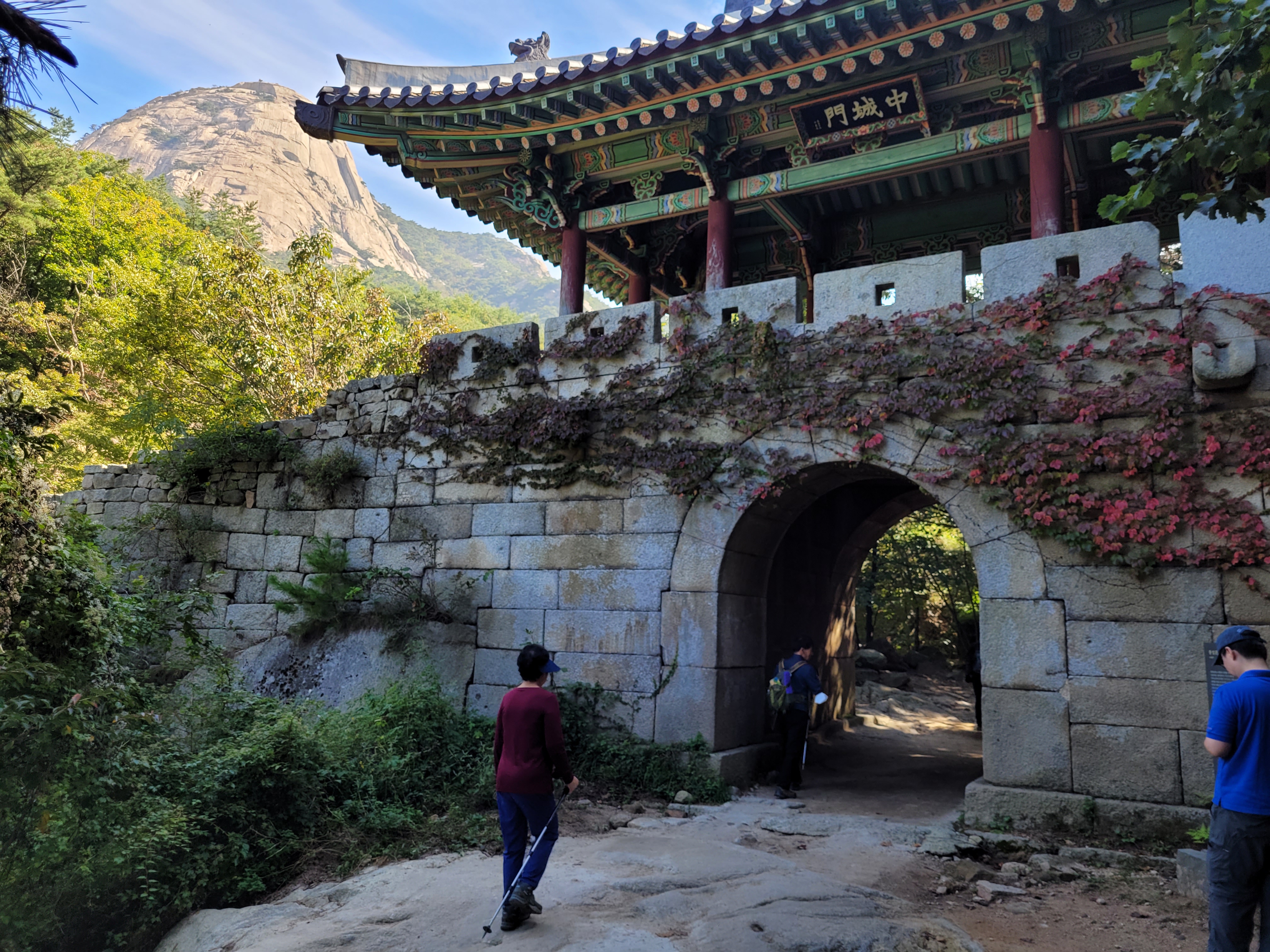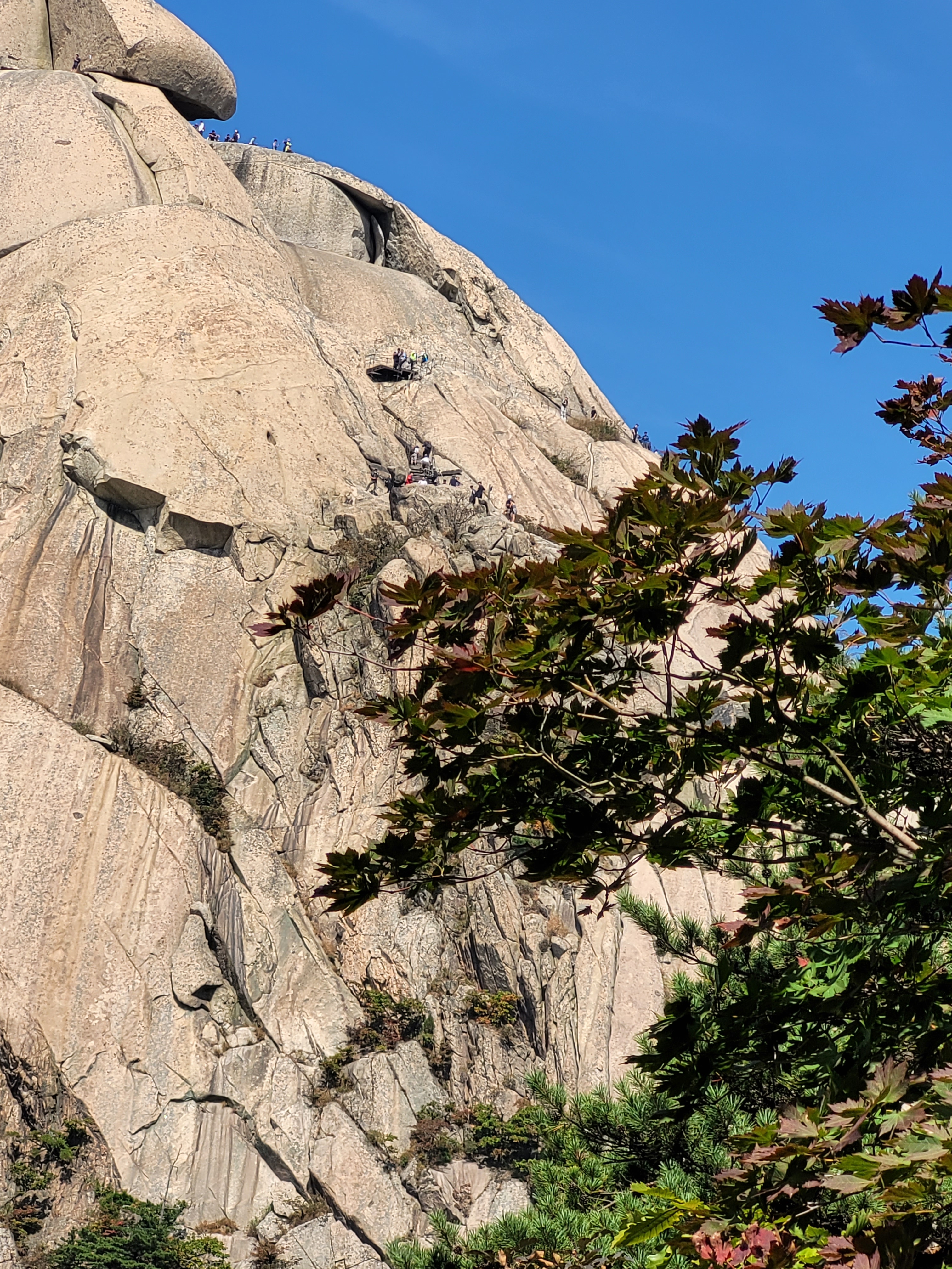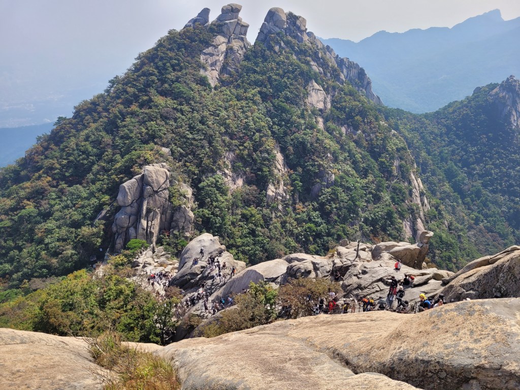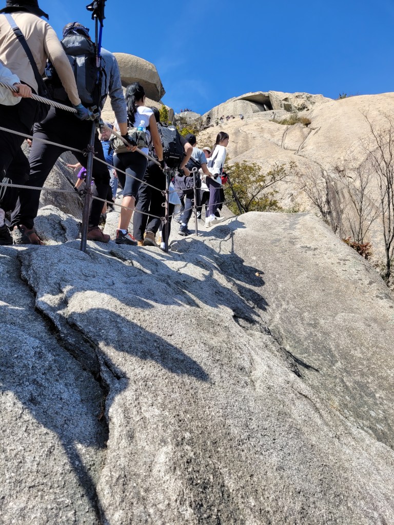 I am in awe of the fact the Korean people totally take this in their stride. Like, yup, this is fair game and a totally OK outdoor pursuit. I saw people in normal trainers slip sliding their way both up and down the rock. I saw little kids being pushed or dragged up the cliff by parents. I saw people who didn’t want to wait in the queues barge past other people to get through, including individuals who then just started free climbing the rock face. How do these people not die?!
