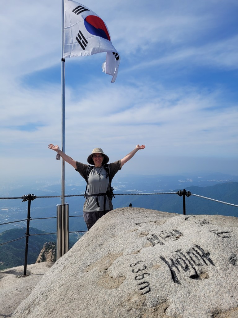 It’s almost time for me to hit the summit, so I take a deep breath, and turn around to the two young girls behind me who look a little startled when I say excuse me in Korean. I then try to explain (in Korean) that I am alone and gesturing with my phone to ask if they would take a picture for me at the top. They are very kind and agree to do so…