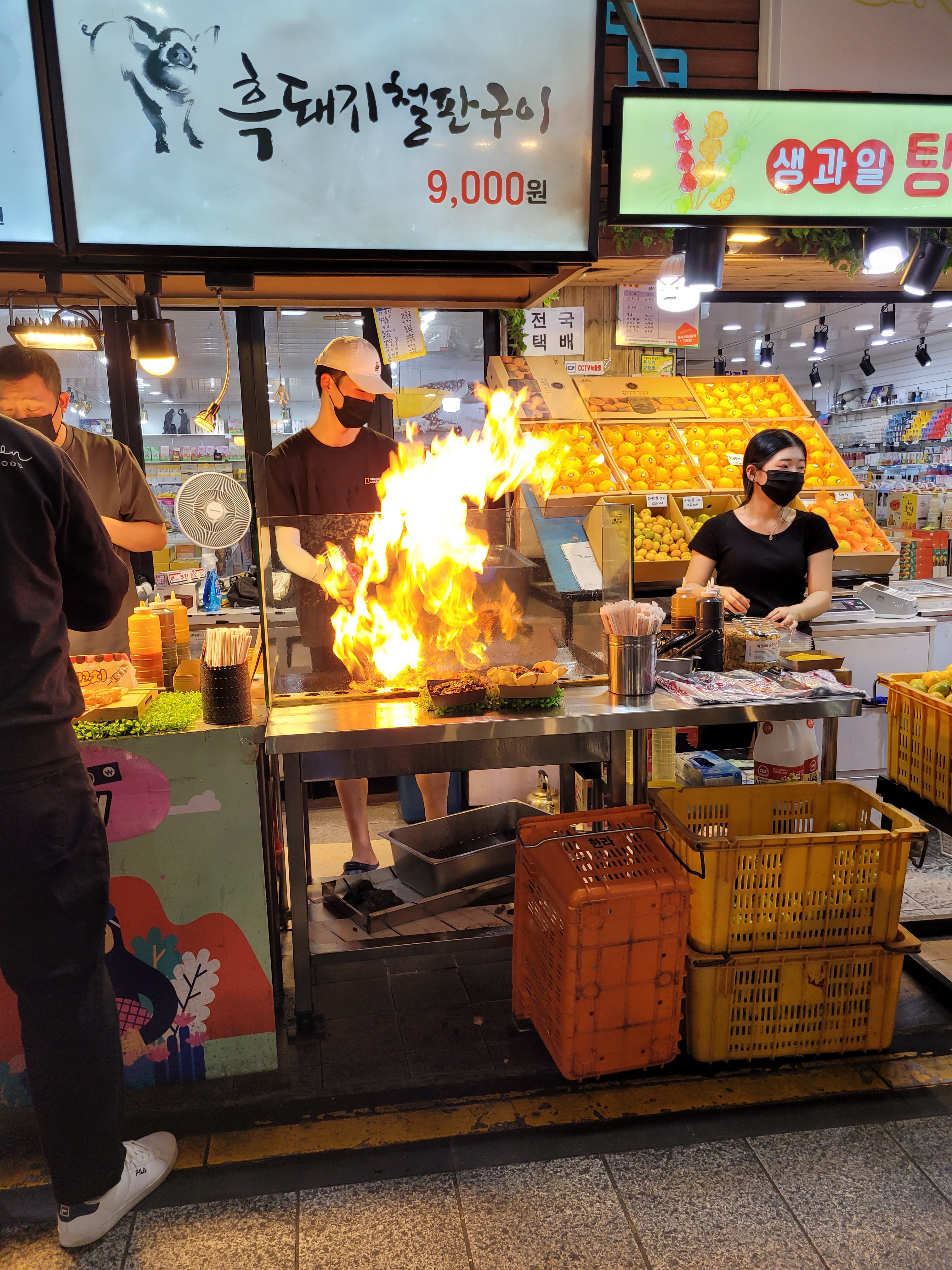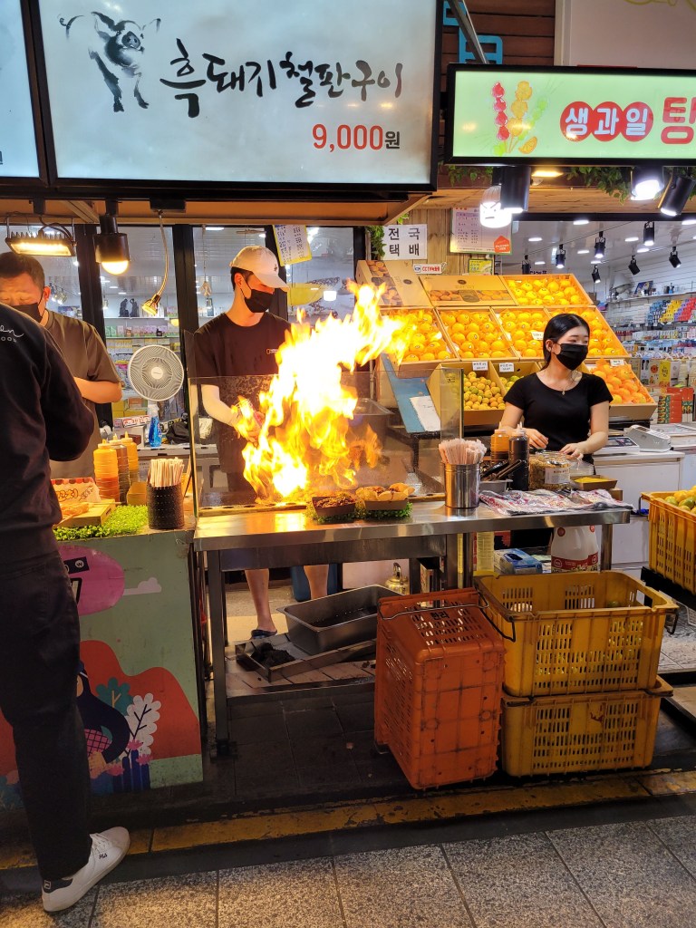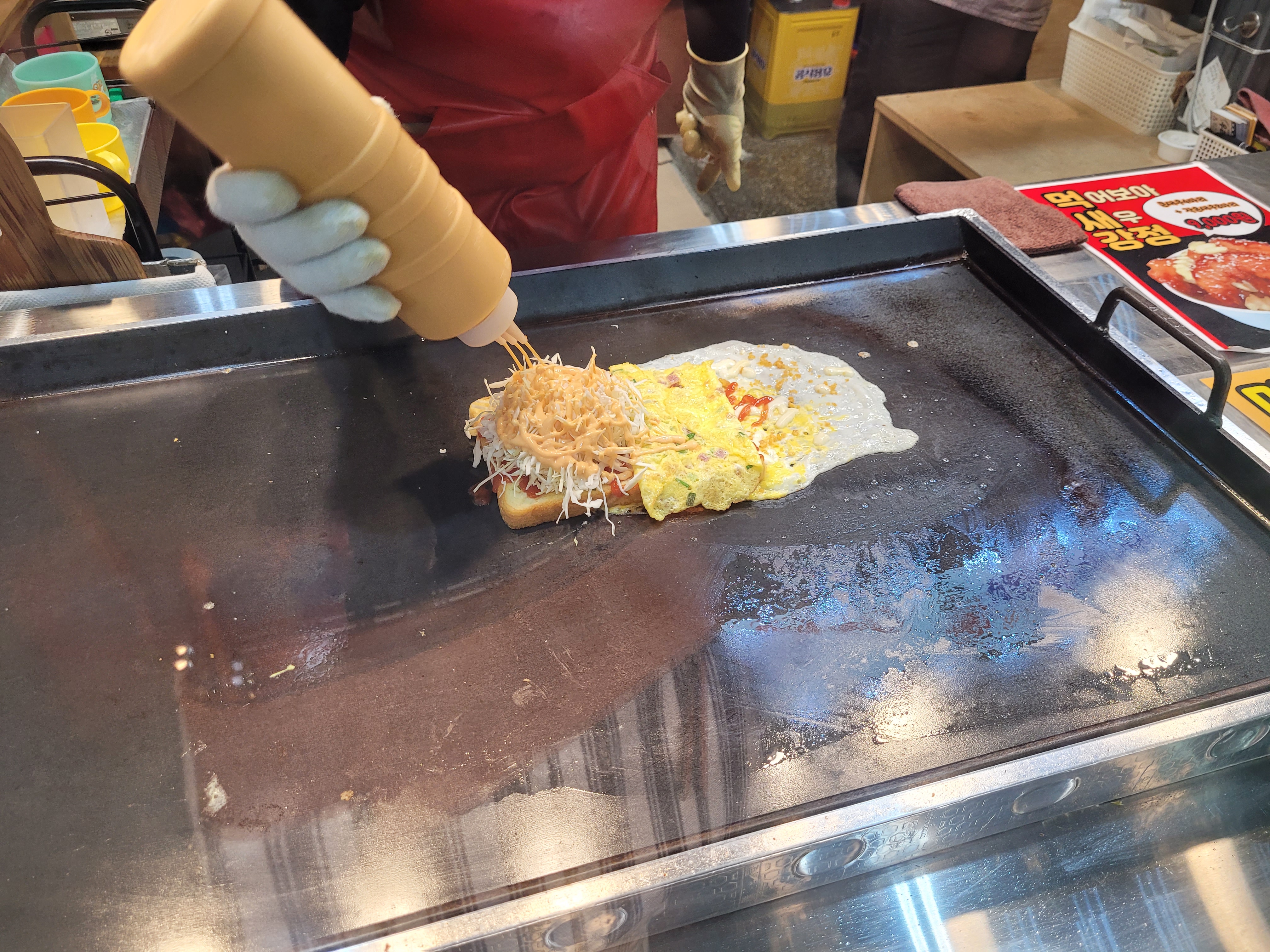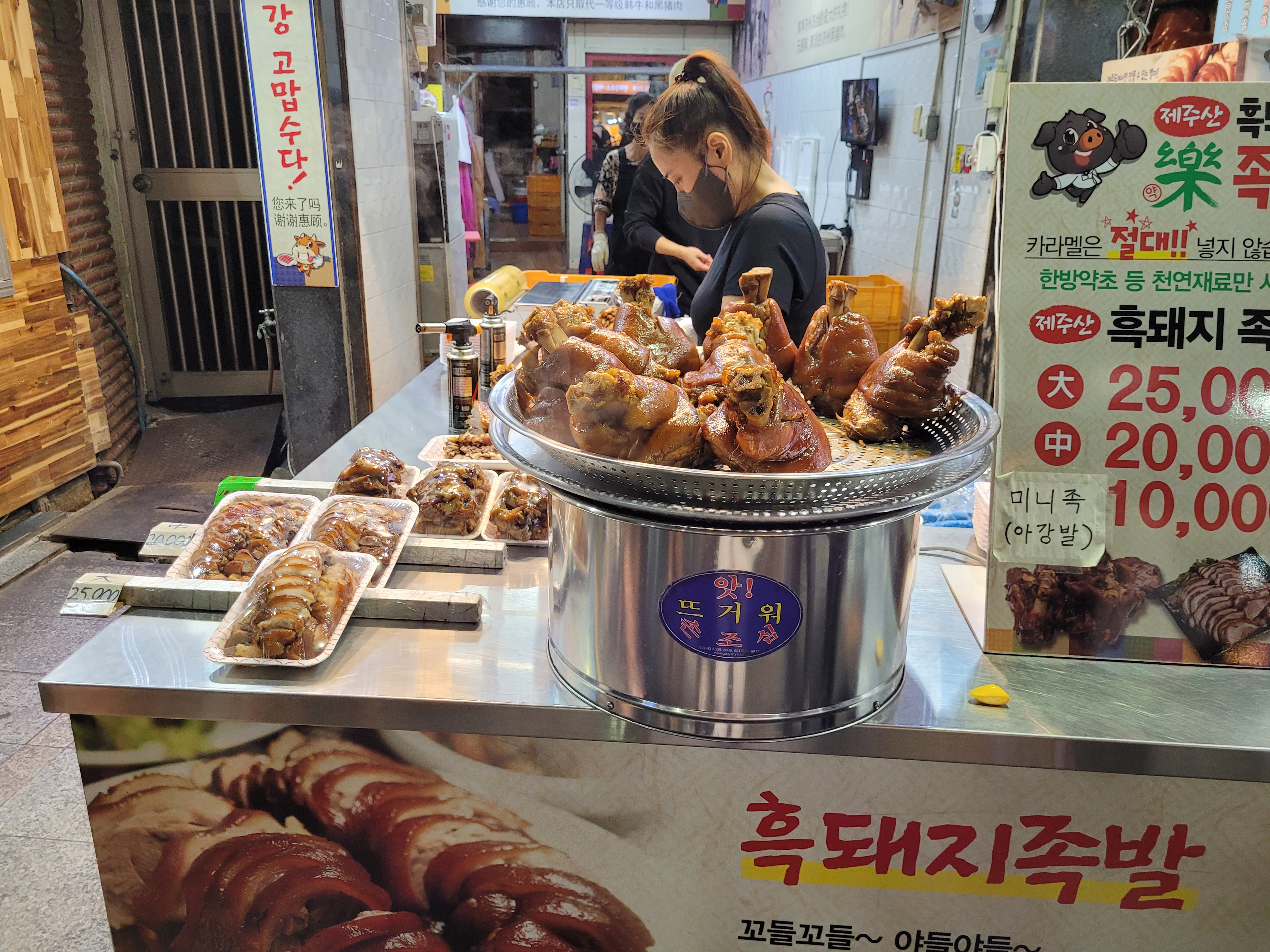As I was milling about in the hallway checking out the noticeboard (as you do), a young chap rounded the corner, took one look at me and in English said ‘Do you want to get food?’ I immediately give him a thumb’s up, and that’s how on my first evening I ended up eating this amazing garlic and egg toast sandwich and a black pork croquette at the Seogwipo Maeil Olle Market with an Israeli bloke who was traveling around Korea too. And it was at that point I remembered that sometimes you get to experience small random stuff in life when be-bopping around the world that makes you smile.