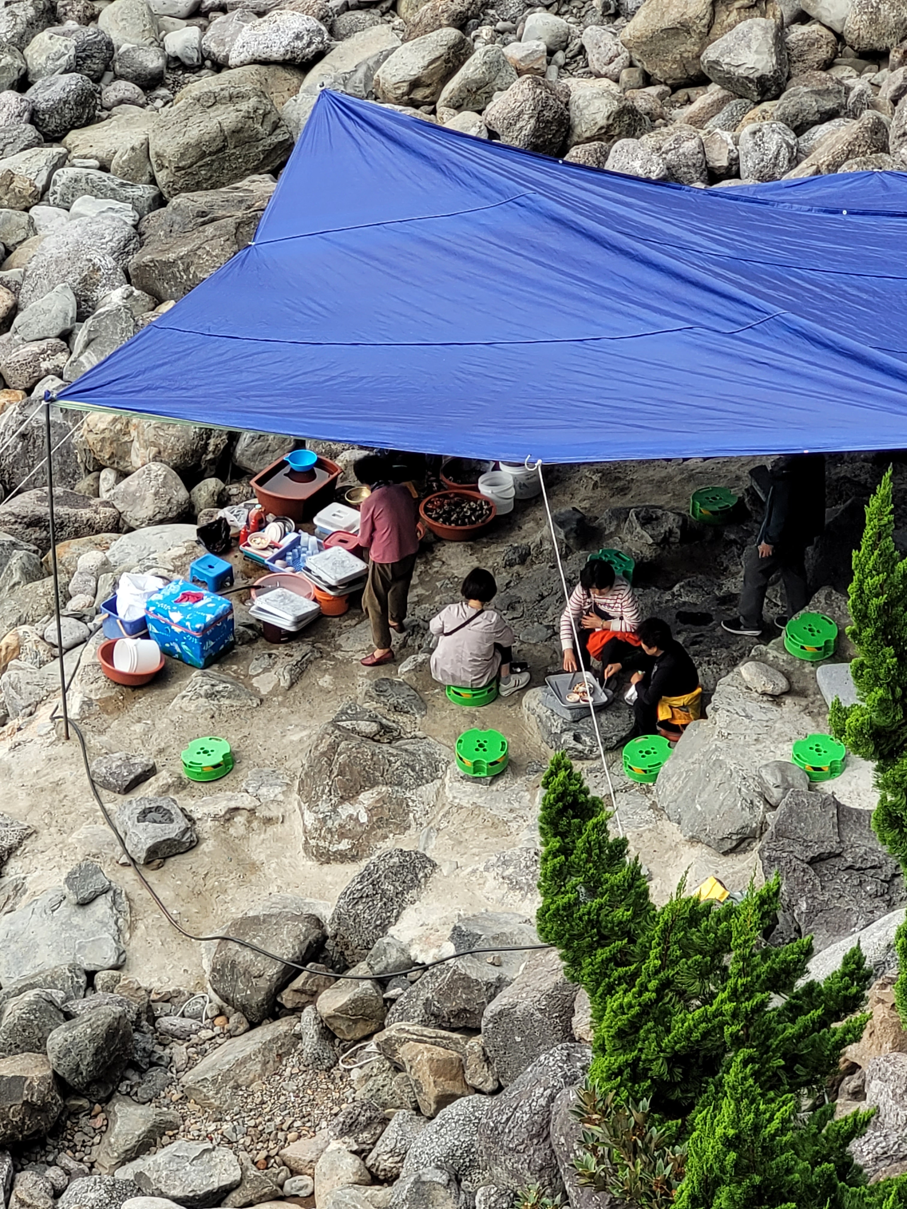 Set slightly away from the falls was another hive of activity, equally interesting to watch. Under a rigged-up tarp and poles sat two little old ladies surrounding by bowls of water and rocks. One lady would dip her hand into a bowl of water and pull out some type of shell fish and with a sickle-shaped knife in hand, crack open and scoop out the contents of the shell. This would then been cut into smaller pieces, put into a sieve, swirled in another bowl of water, and then tipped out onto a plate where lady number two would then add kimchi as banchan and deliver it to waiting customers perched on rocks at makeshift stone ‘tables’.