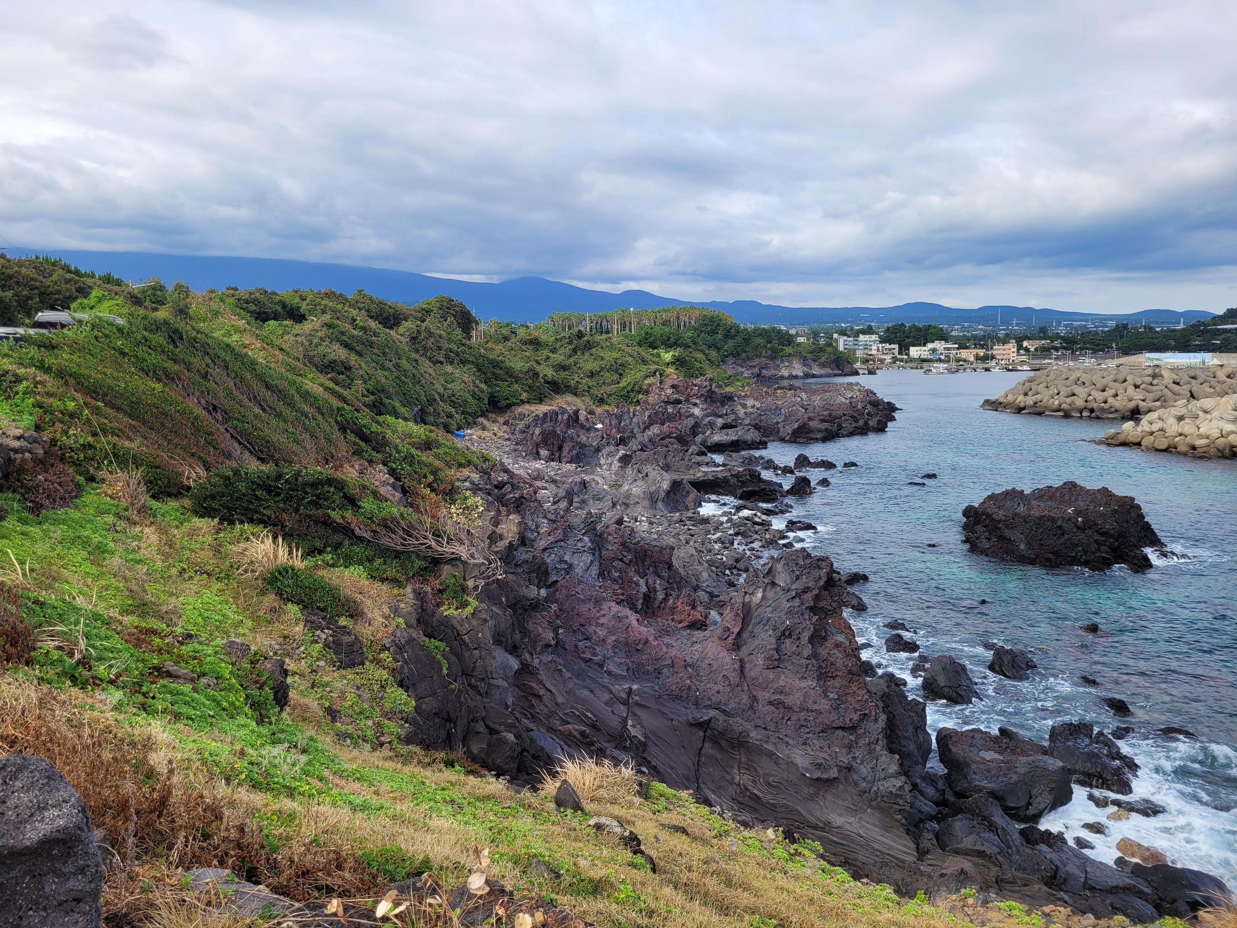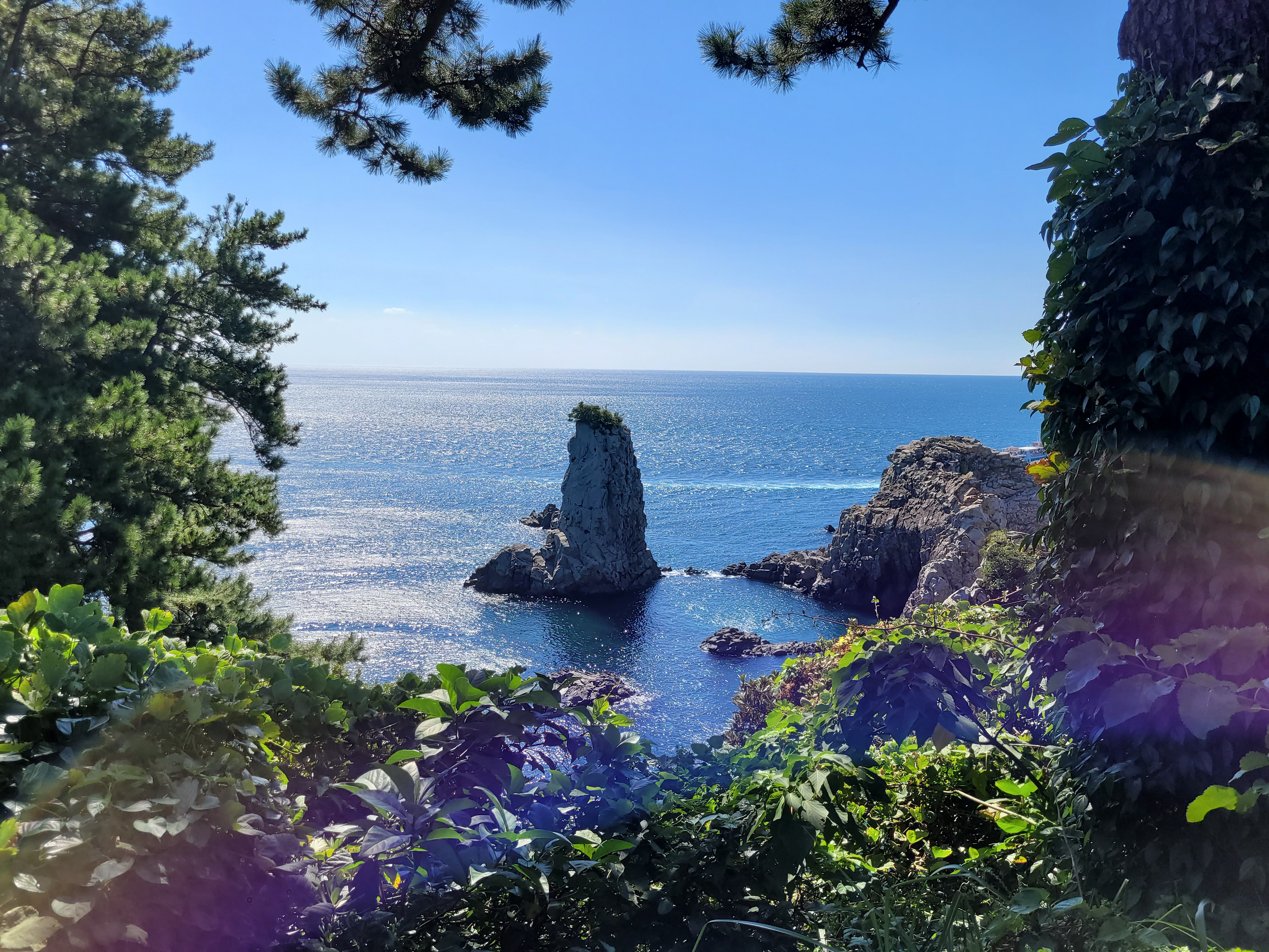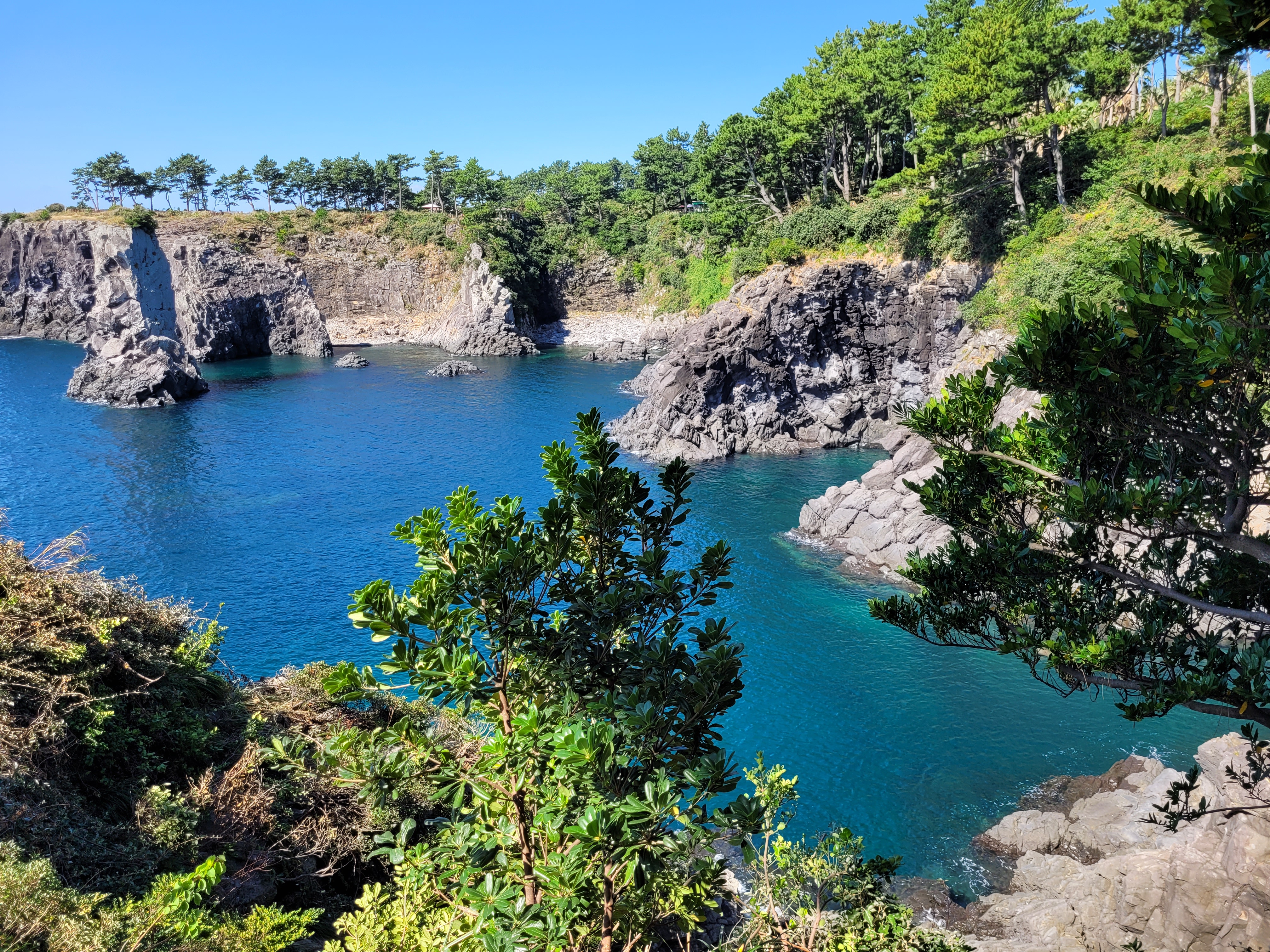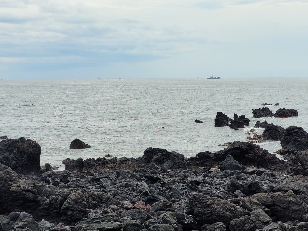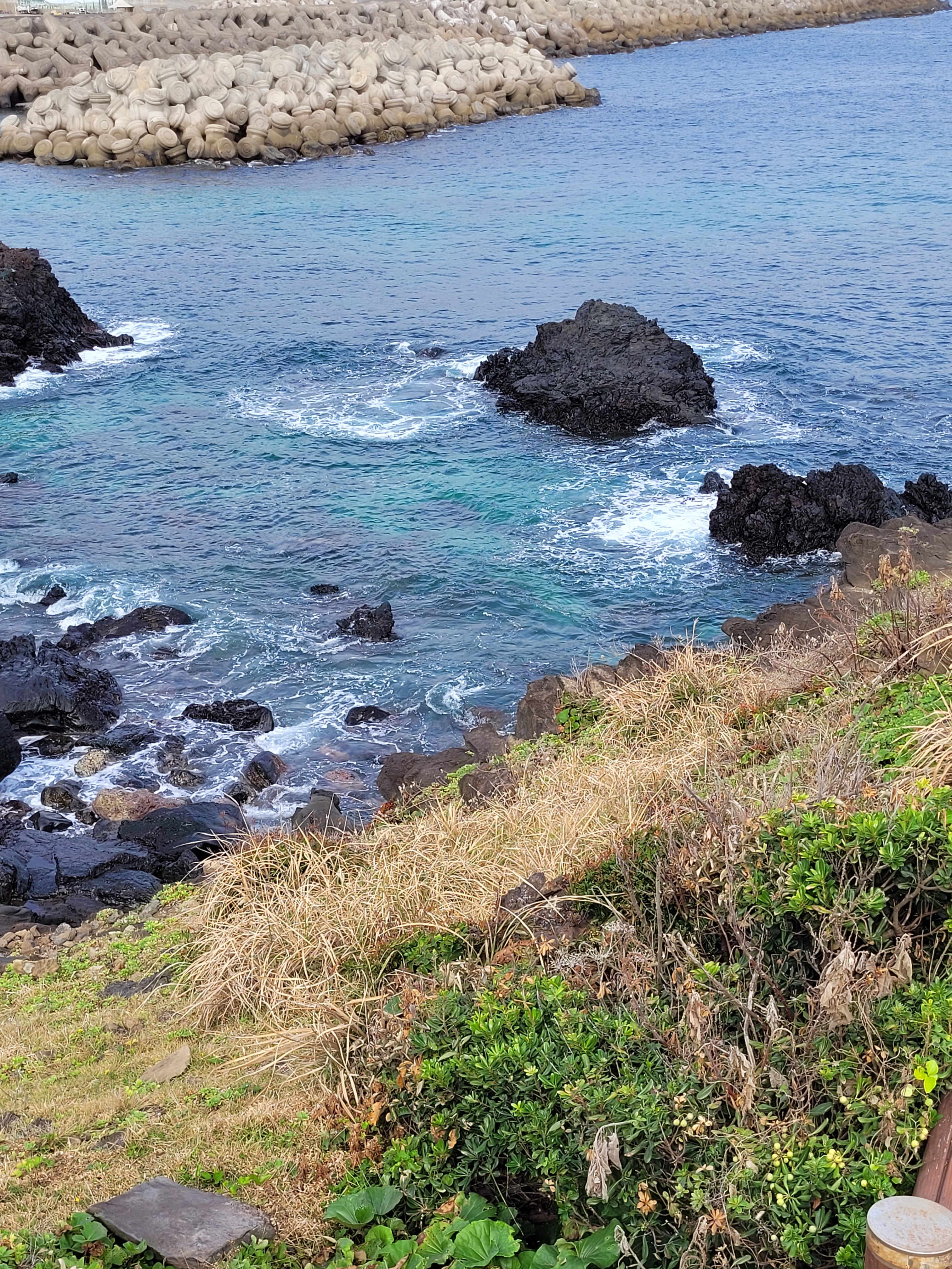 Jeju is a volcanic island, so all of the rocks around the coast are black basalt, the type that have air holes in them, slightly like a pumice stone. In some areas of the island, you will even see hexagonal columns of basalt. The sea here is also various shades of blue and green and very inviting for swimming or diving.