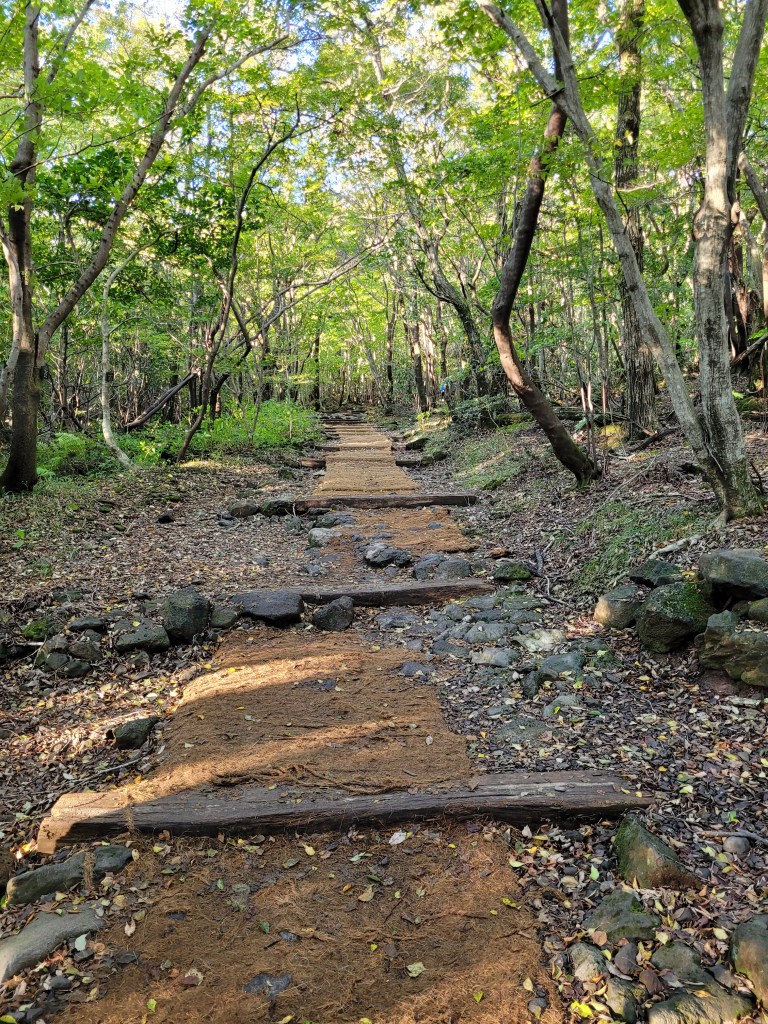 I approach the trail entrance and a nice lady checks my email reservation, scans my QR code, and wishes me a good hike. I would like to point out right now that while at the base of the mountain when I start hiking the trail looks like this…