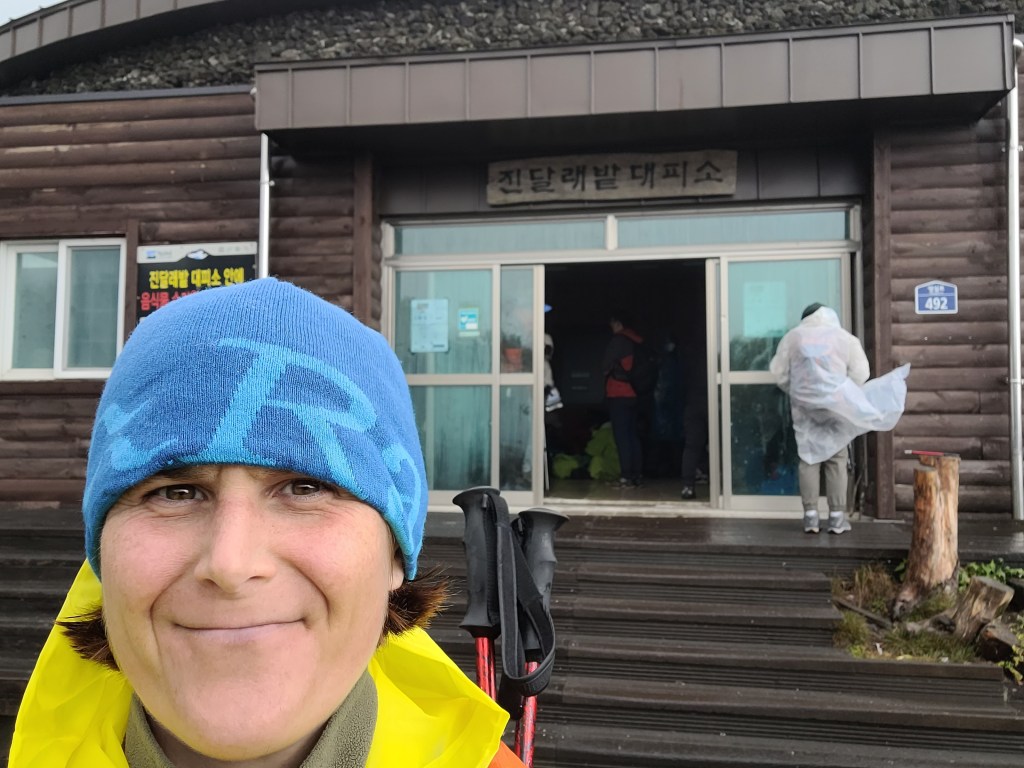 I wander into the shelter, which is an actual building as opposed to a sleeping shelter, and find it rammed with people sitting spread out across the floor, dripping wet, literally steaming, and munching food. I join them. Squash myself into a bit of a corner and chew on my snacks while listening to a pre-recorded message in Korean which I 100% don’t understand but can 99% guess is telling me the summit is closed today.