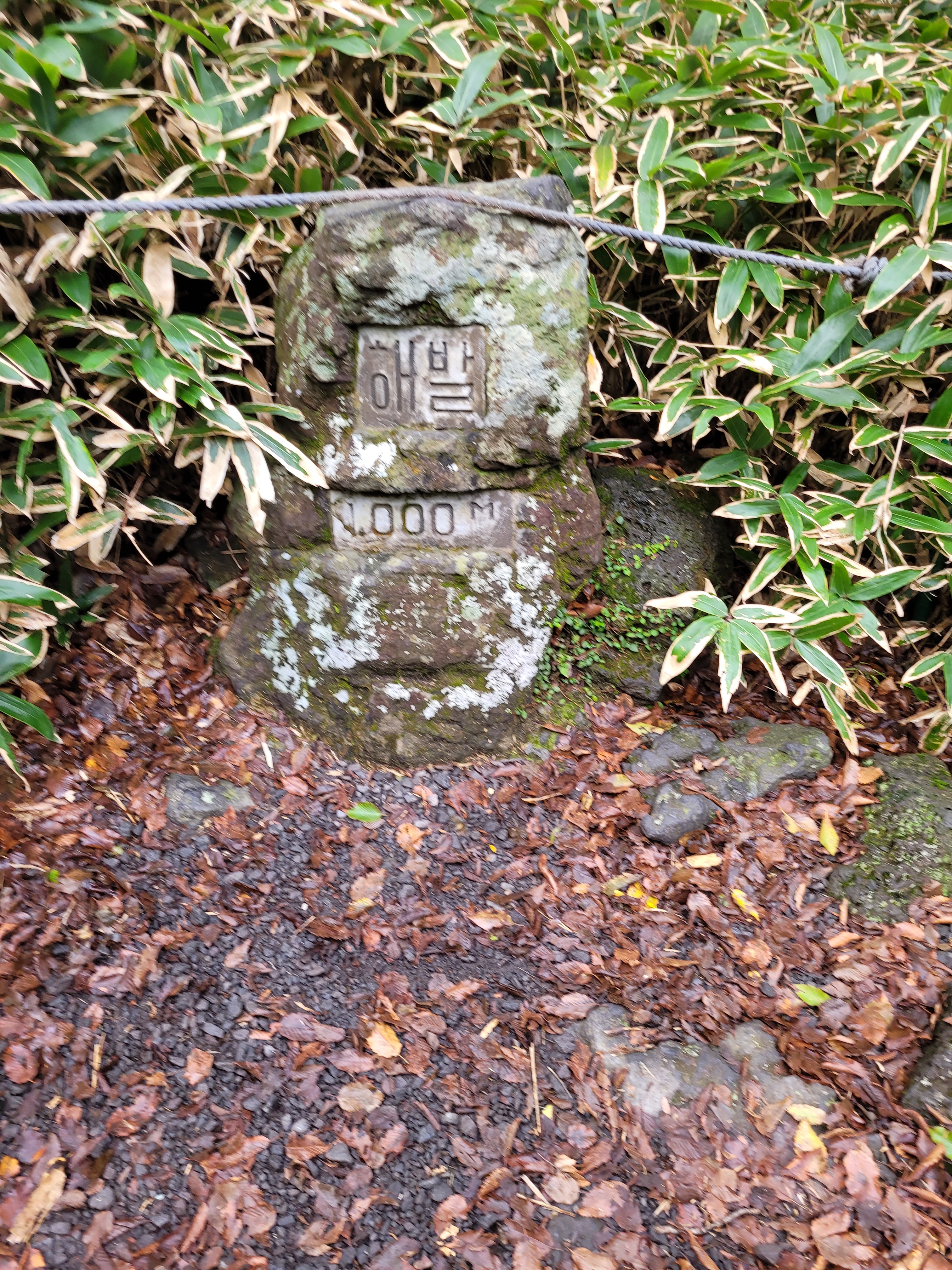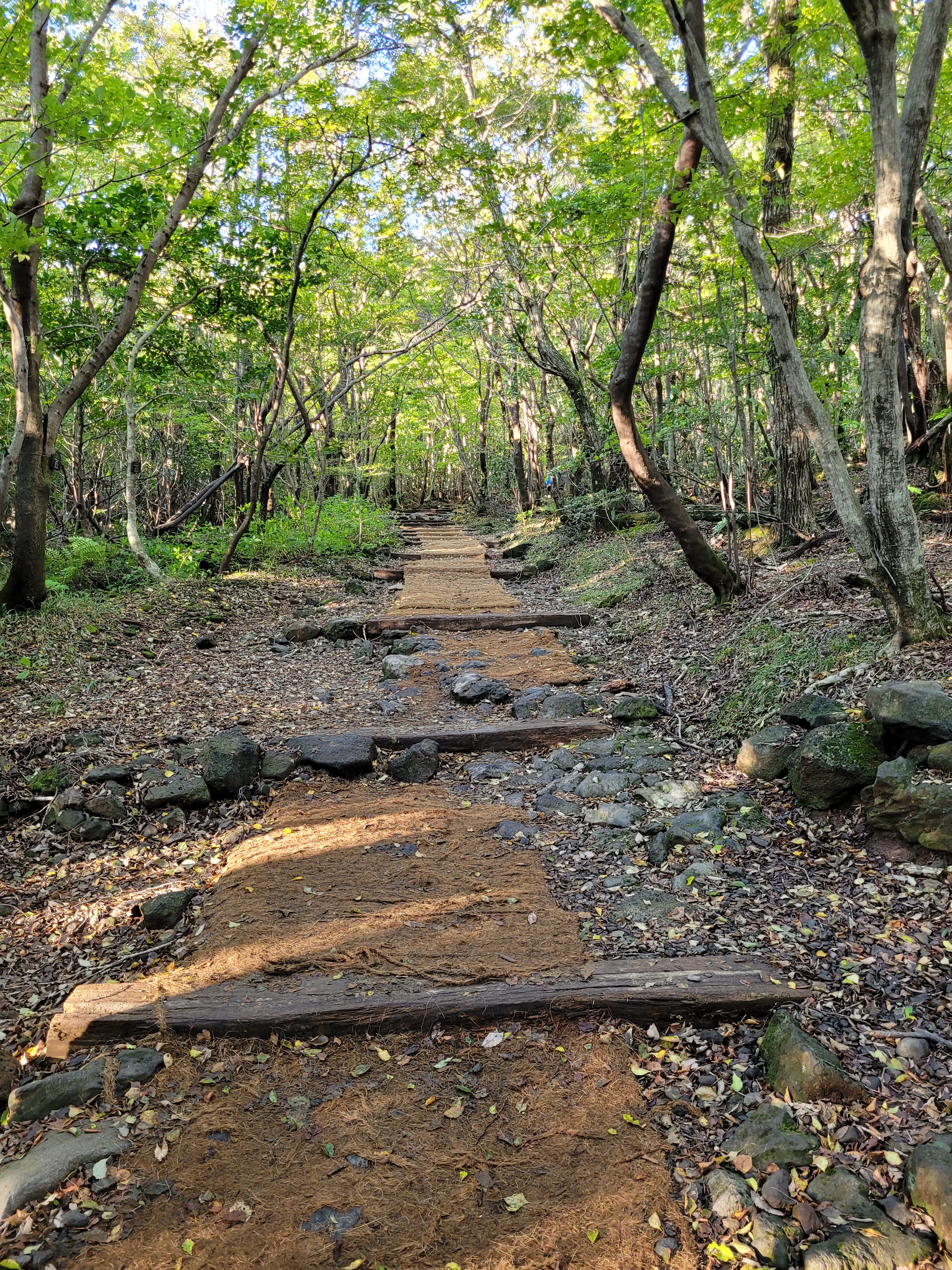 It was a bog standard upward march through the trees; walking over hemp carpet paths, stones, and some stairs. There was nothing of outstanding value or interest to this climb. Except this stone. I felt good when I reached it at least.