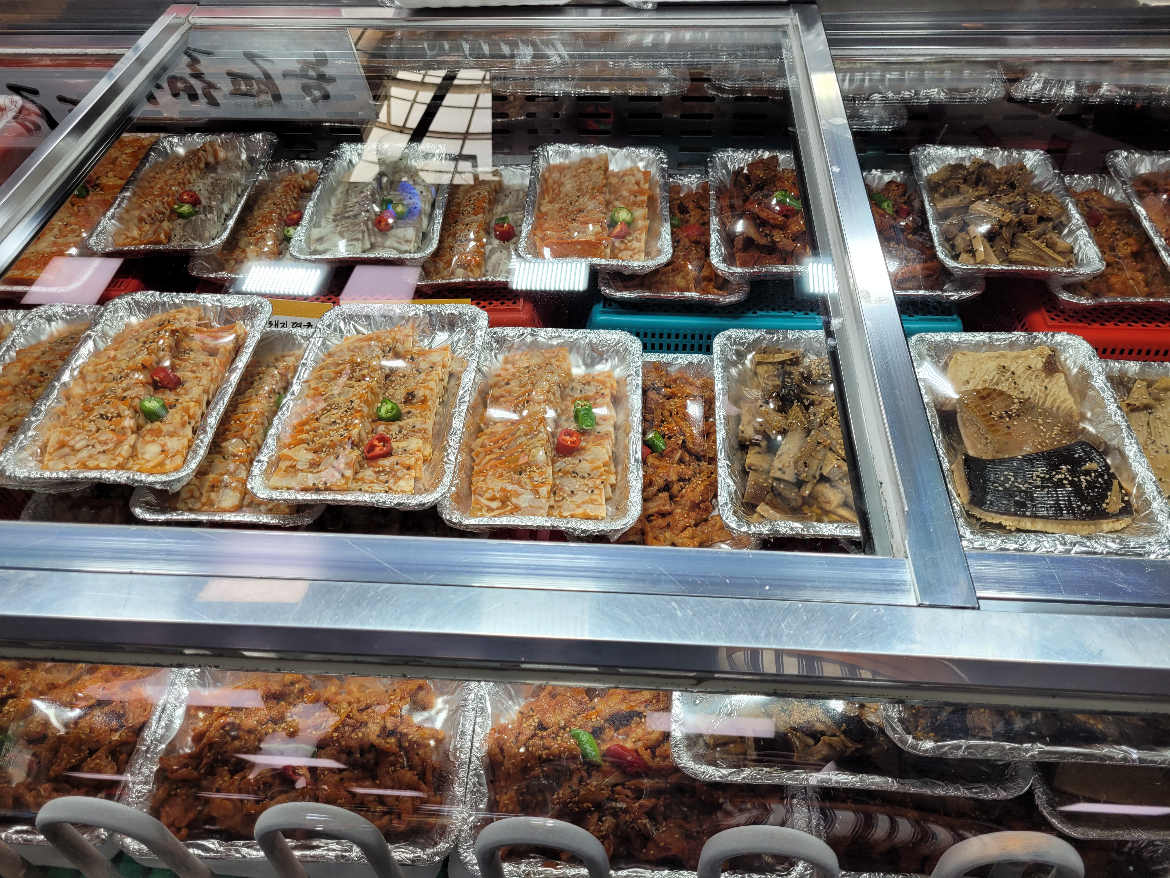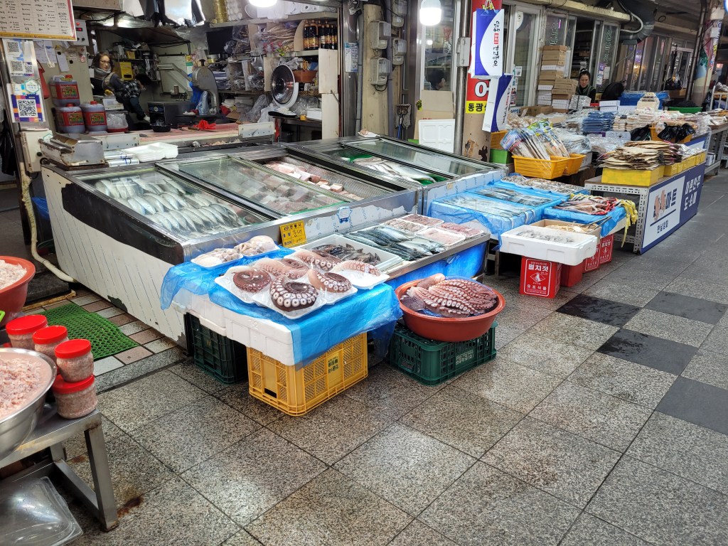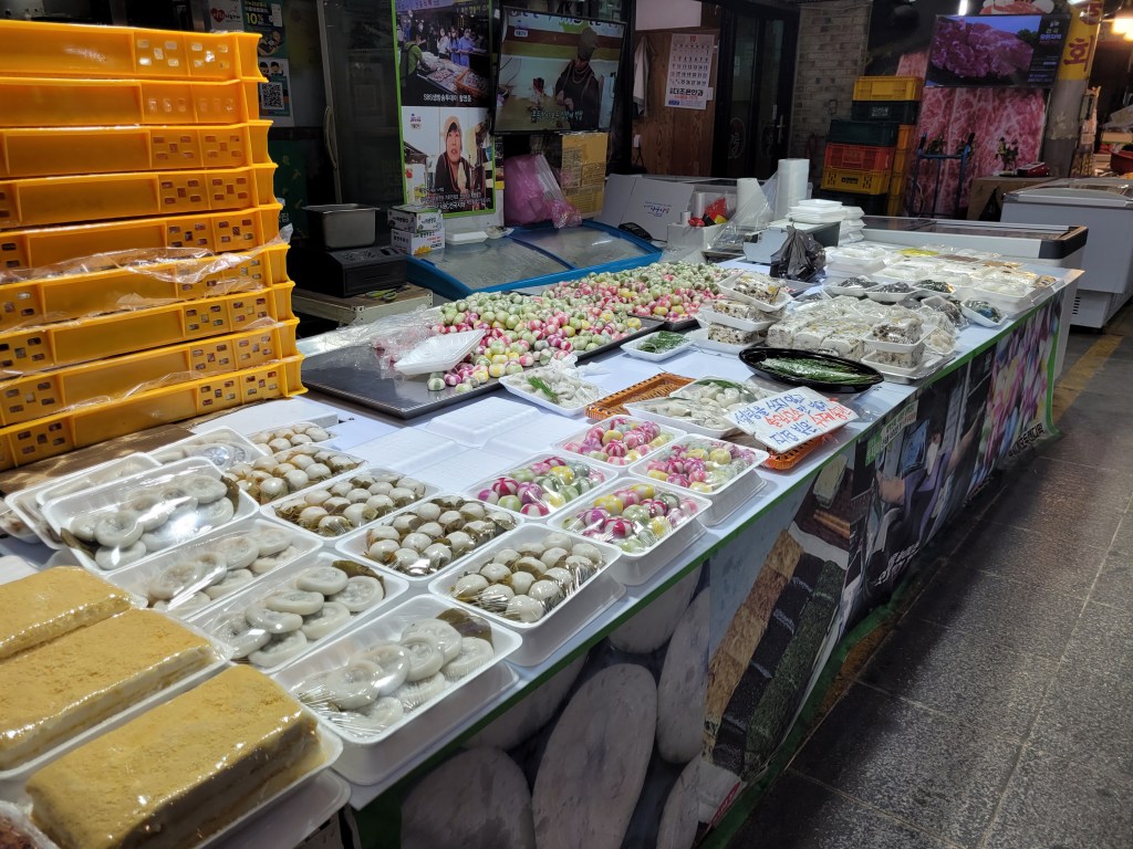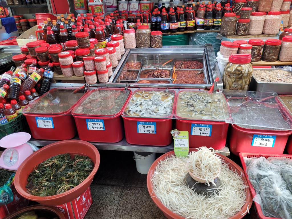 I also love food markets, there are so many daily fruit, veg, spices, fish, and everything in between markets everywhere I go. They are stocked to the brim with every item a hardcore Korean cook (or just a normal everyday cook here) could possibly want or need. I personally would never be able to buy anything in a market place because I can only identify about 1% of the produce I am looking at, I have no idea how to use any bar a handful of the items, and I have no idea how these things are sold – there appear to be no scales or measuring devices to hand and no prices; I wouldn’t even know what to ask for – ₩1000 worth? Number of things? A Korean halmoni handful? Not a clue. But I love the fact these markets exist, are a used resource, a daily occurrence. The only markets I see like this at home tend to be posh farmer’s markets that stock upper class speciality organic type goods, and that is nothing like the Korean markets I am talking about.