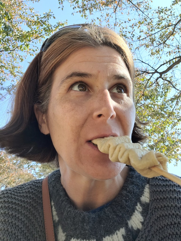 Today, with no-one else around, I googled the name of what I was asking for and then approached the lady for one. They are usually kept warm in a great big pot of liquid soup broth, and just plucked out when needed. Grasping my stick I sidled off to a nearby bench and proceeded to munch. I really like fishcake I have learned. I never would have thought it, because in general I am not a fishy person, I don’t like the strong taste of fish, a bit of cod is mostly what I’ll stretch too. But as I am discovering with a lot of foods here, I am actually more open to new and different flavours than I would have imagined and am enjoying my culinary journey.