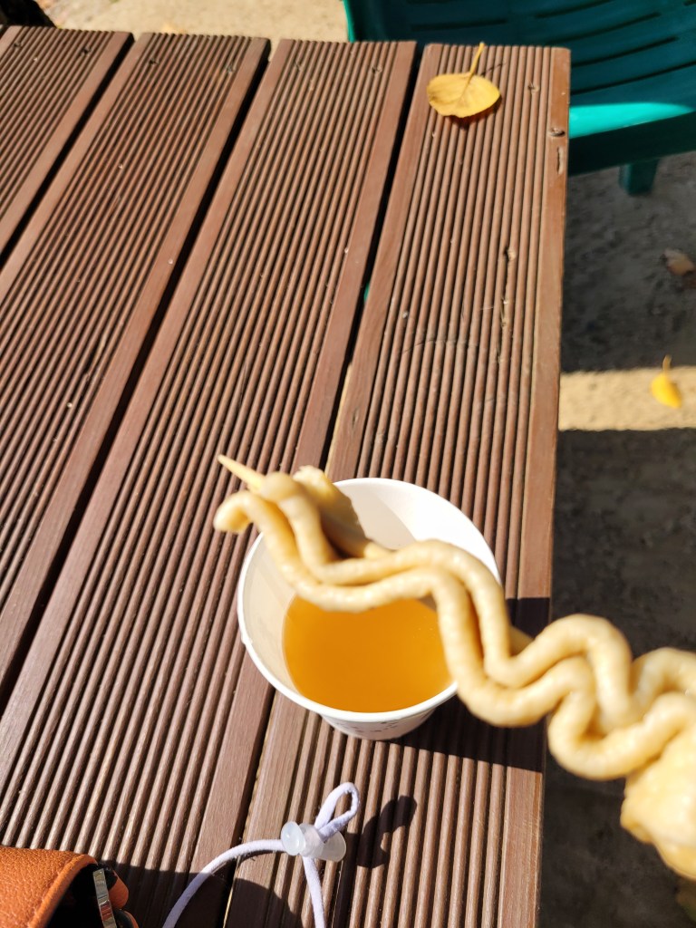 As I was chewing away happily (yes, the texture is a bit chewy and stretchy), the vendor approached me holding a cup. Ahh, it turns out that usually you eat the sticks at the stall, dipping in sauce (probably soy or chilli-based), and drinking a cup of the soup (I have since watched others do this – it’s all a learning experience!). It was nice of her to bring me the soup, obviously noting how clueless I was, and as I enjoyed the skewer so much, I went back for a second.