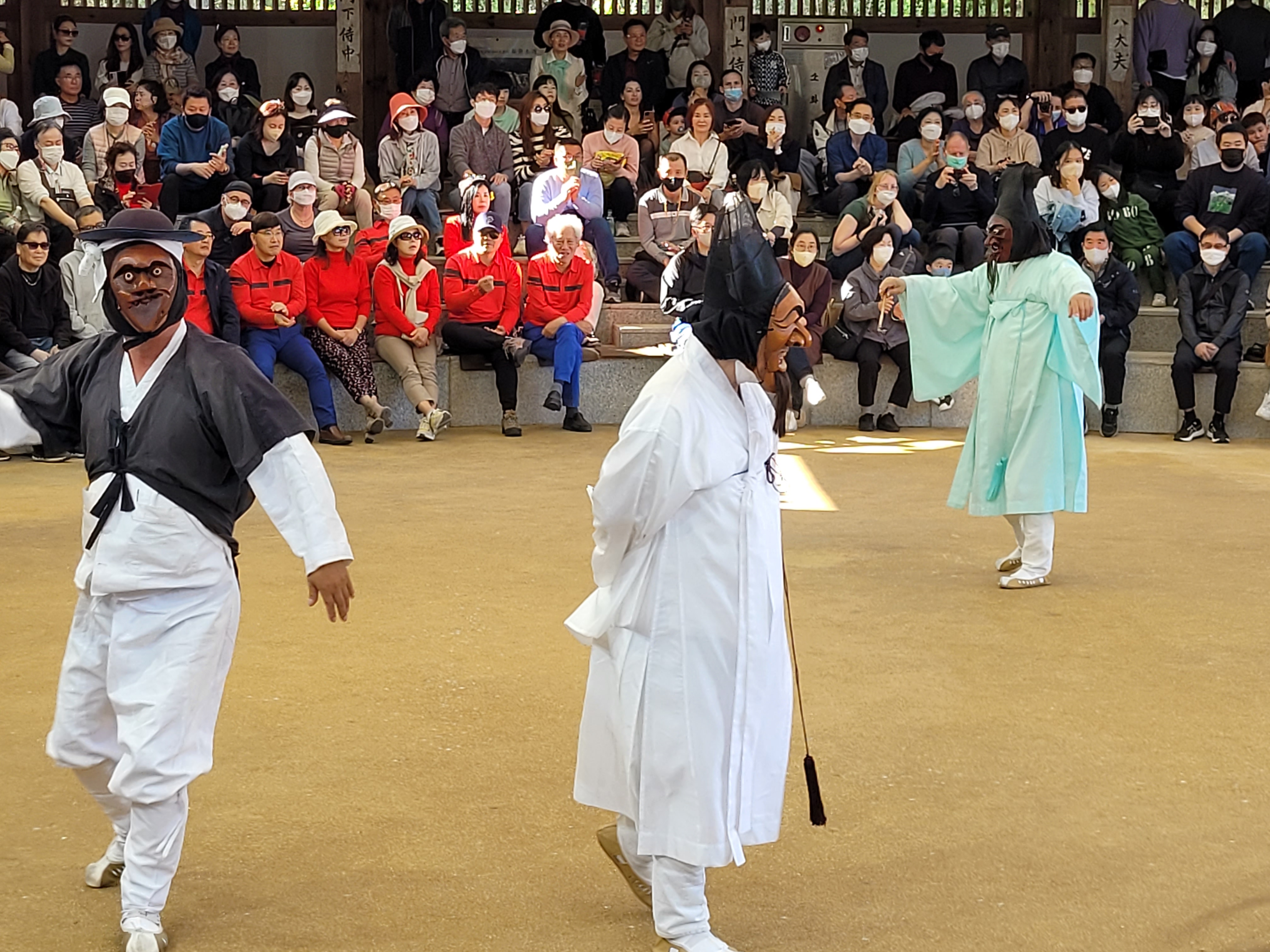Traditionally, the mask dance was to be performed in January at the beginning of the lunar New Year as a shamanistic/exorcism rite, to pray for peace and good harvest. But obviously now you can watch this every day at the village.