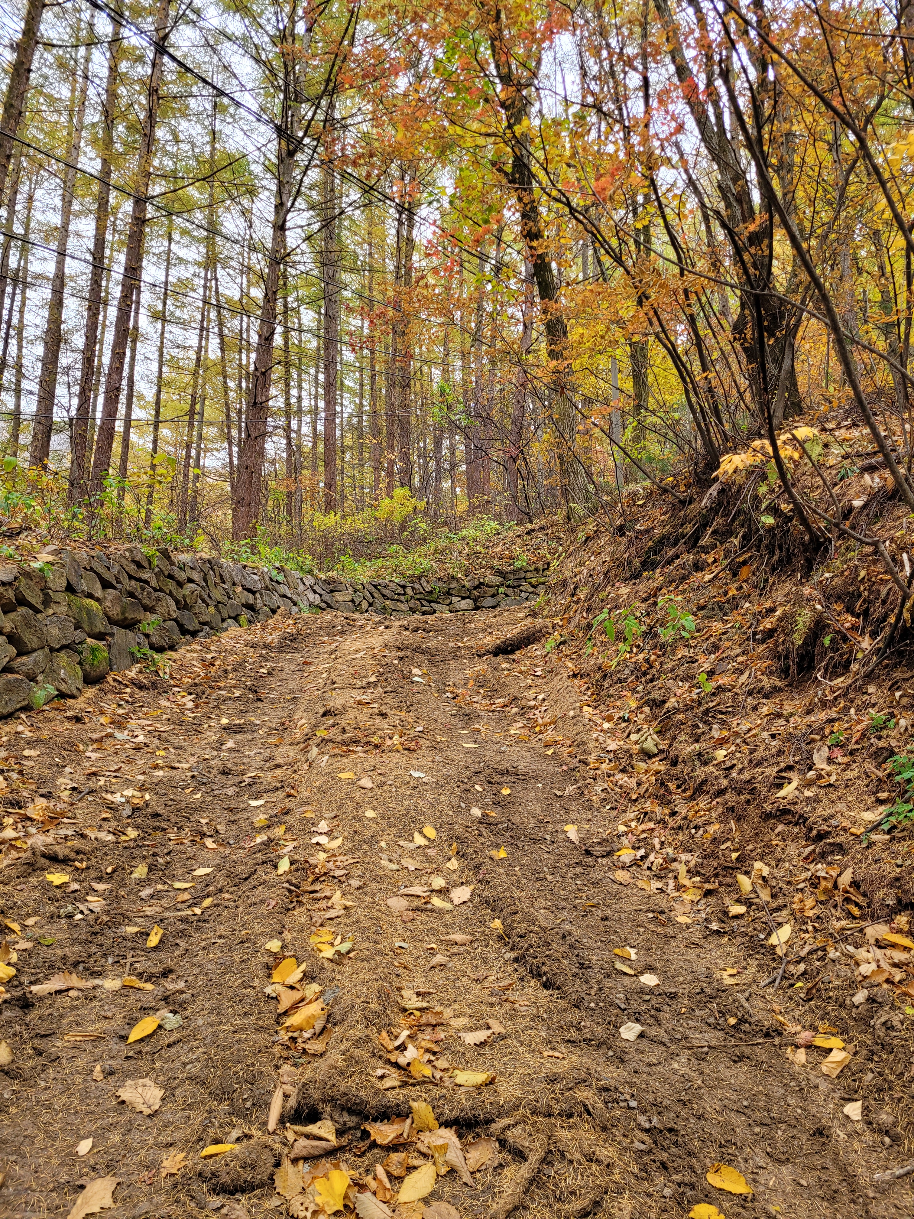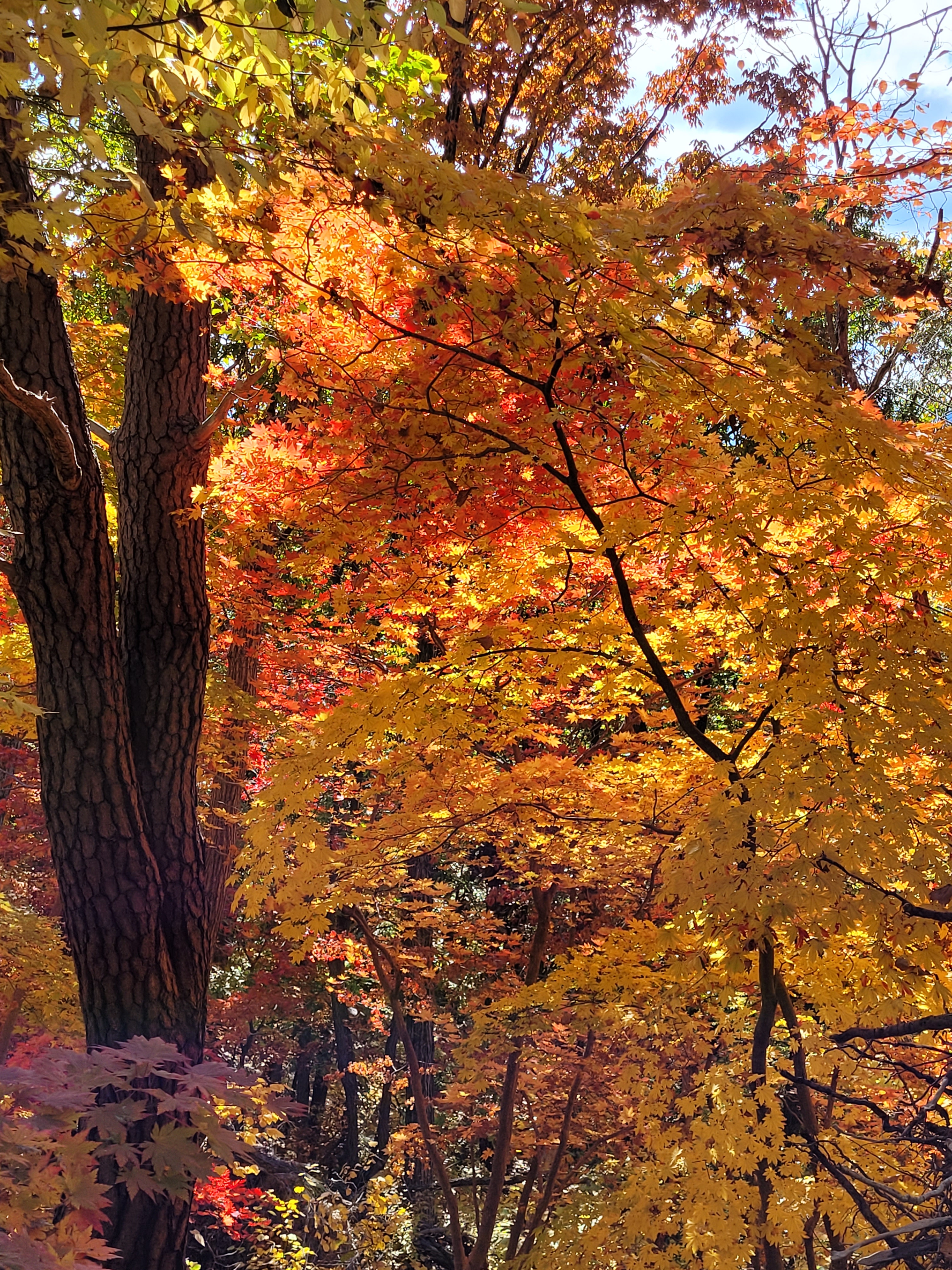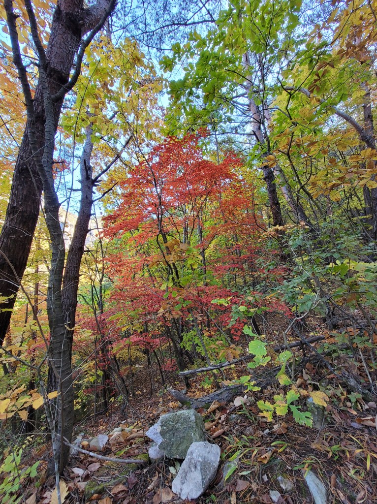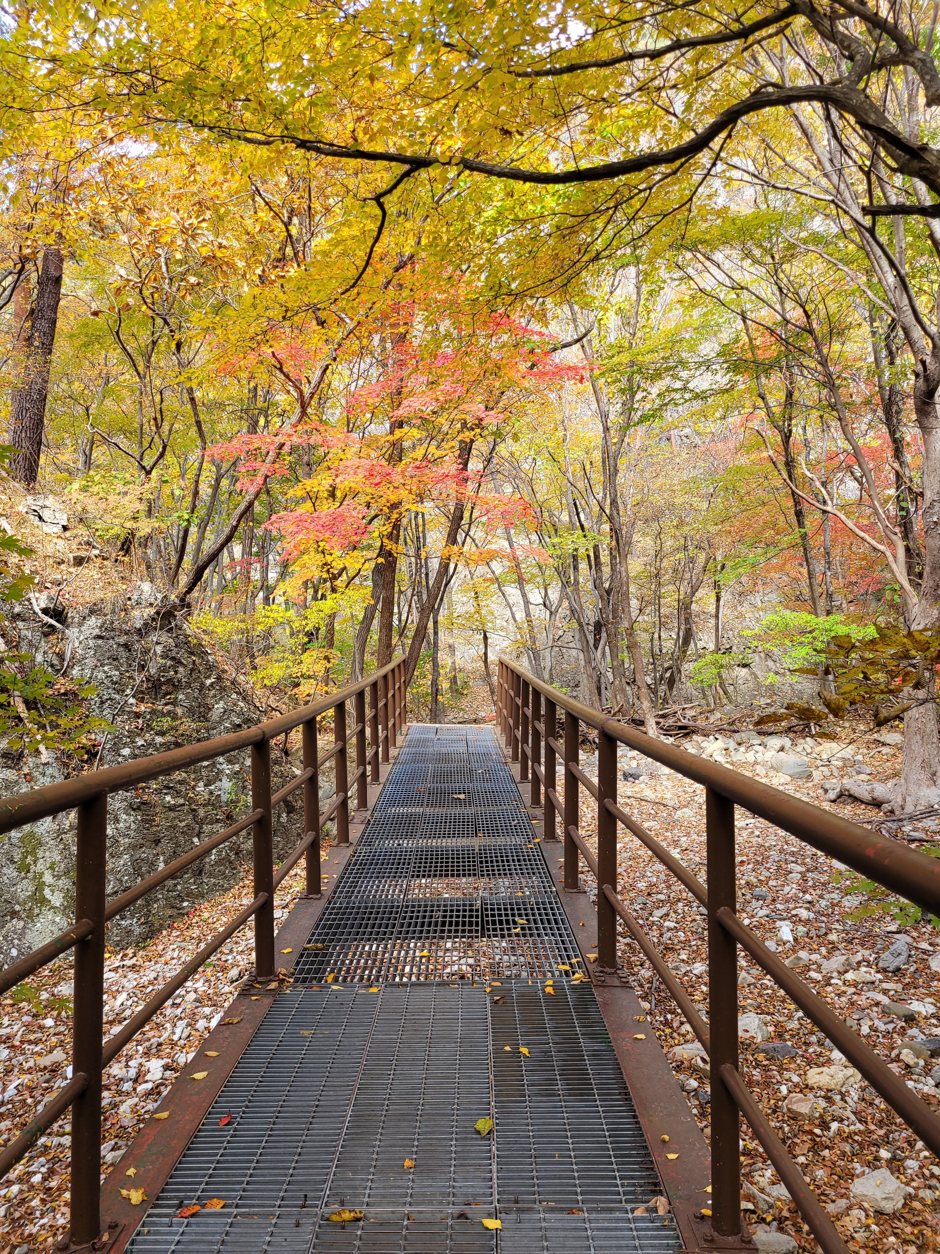 On I go and the further I hike, the prettier it becomes, turning mostly into a forest walk which I appreciate. The colour of the leaves continues to astound me. At home I think we get a really pretty bright green spring foliage, but it certainly doesnโt beat the colours I am seeing here in the autumn in Korea โ this is tremendous โ natureโs artwork for sure.
