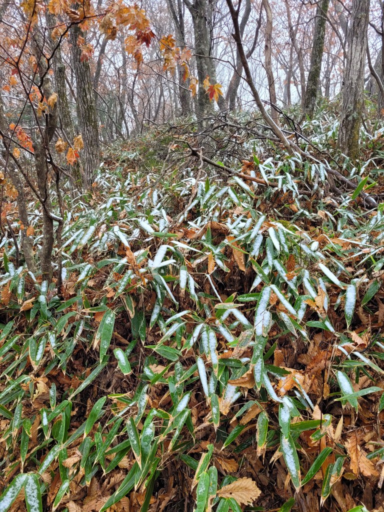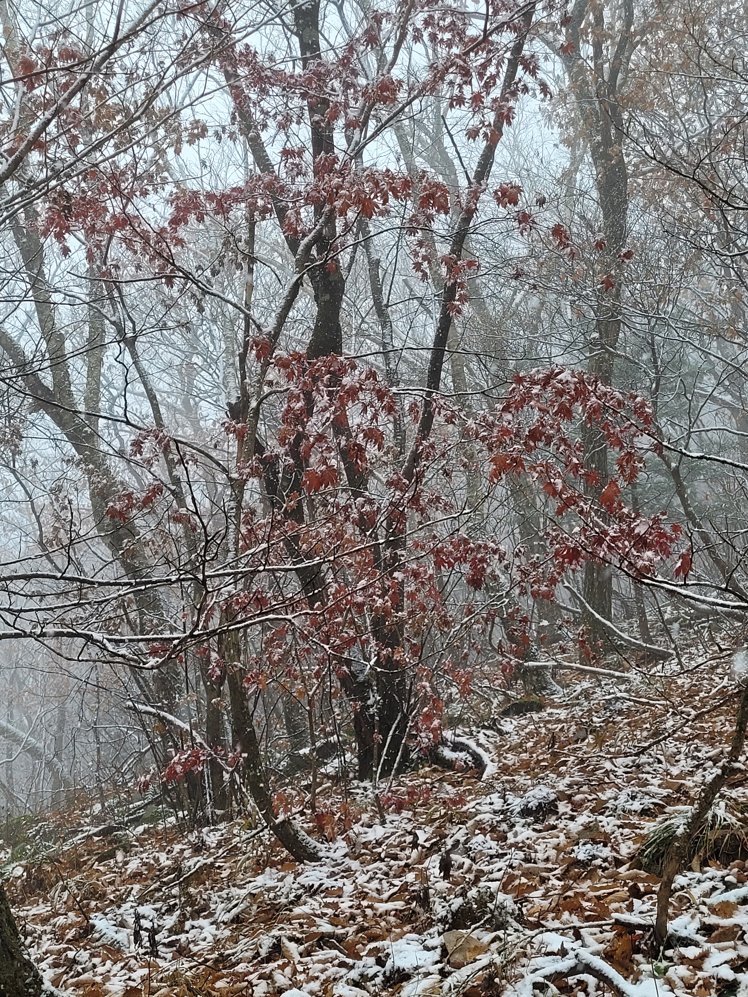 On I walk, not another soul in sight, listening to the snow rustling as it lands on the fallen leaves, and eventually through the fog I spy something ahead.