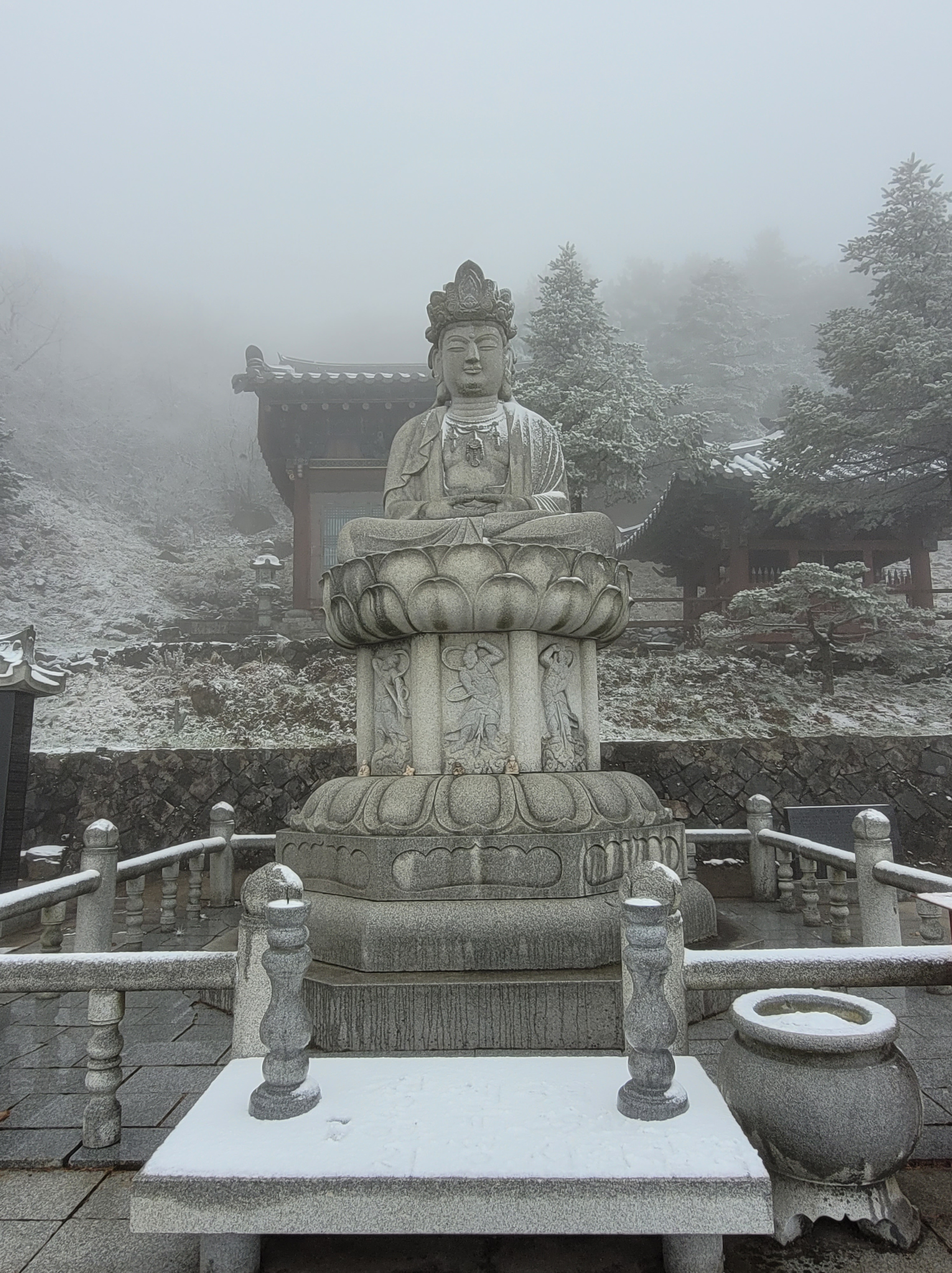 It seems I have stumbled upon a temple, complete with Buddha and his snow-draped shoulders. The weather is getting decidedly more bitter, and it is clear that the summit I am heading for will have absolutely no view to speak of, but nothing is dampening my happiness right now.