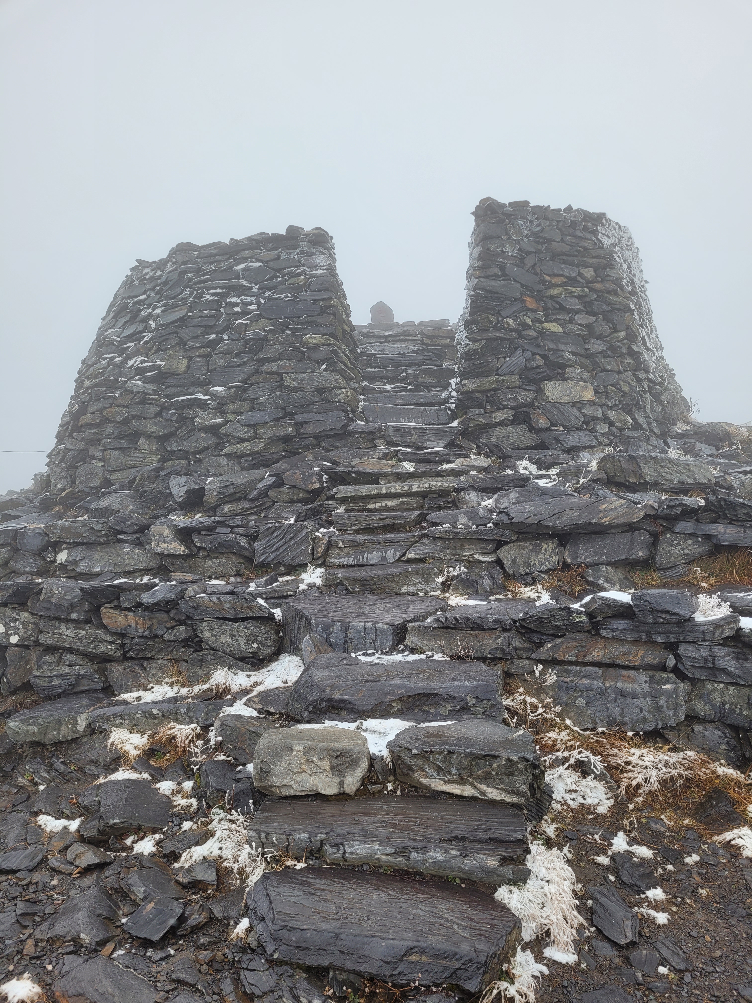 I come across a chequerboard pathway leading upward, which I carefully navigate, doing my best to avoid slipping or falling. My walk takes on a mystical feel with the ever increasing fog, and the occasional appearance of objects slowly taking shape in the mist.