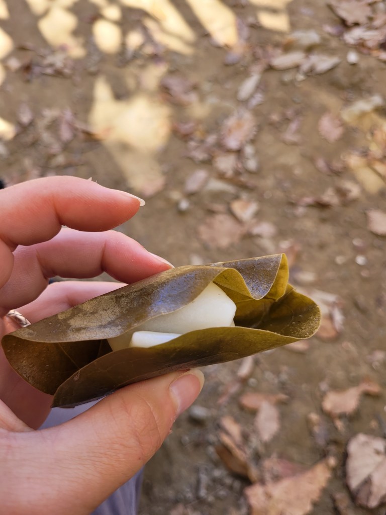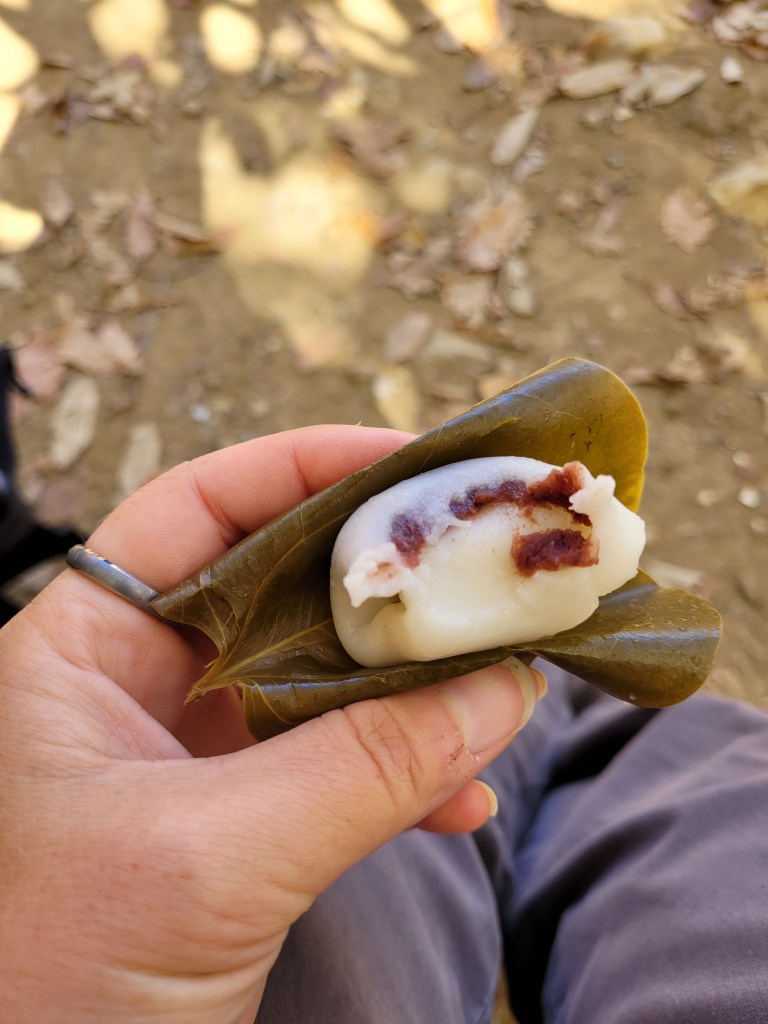 This, as far as my experience and taste ability can tell, is a red bean-filled rice cake (tteok โ the stuff tteokbokki is made from). It is basically chewy goodness combined with a sweet paste. I love it. This is home-made, it comes out of a nice ladyโs lunch box and handed to me, with great thanks given for the gift. I of course have to sit there surreptitiously with it in hand to wait to see how to eat it (the leaf confused me). It appears the leaf is just โpackagingโ to make sure they donโt stick together in the box and I watched the others discard theirs before eating. Right, got it. Committed to memory for future use.