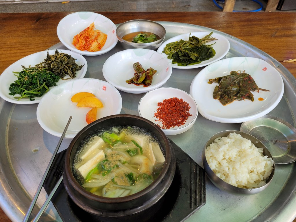 Now, Iโm going to be honest here, this was actually the first meal here I havenโt enjoyed. With the exception of the jjigae (soup) which tasted fine, the banchan that were served (except the fruit which I guess was some type of stewed apple and delicious) were all really astringently bitter. The greens I could only take a bite or two of and the rest I had to leave. So that goes to show me that I have obviously done well so far in picking places to eat, as this is the first time I havenโt liked the way food has been cooked.