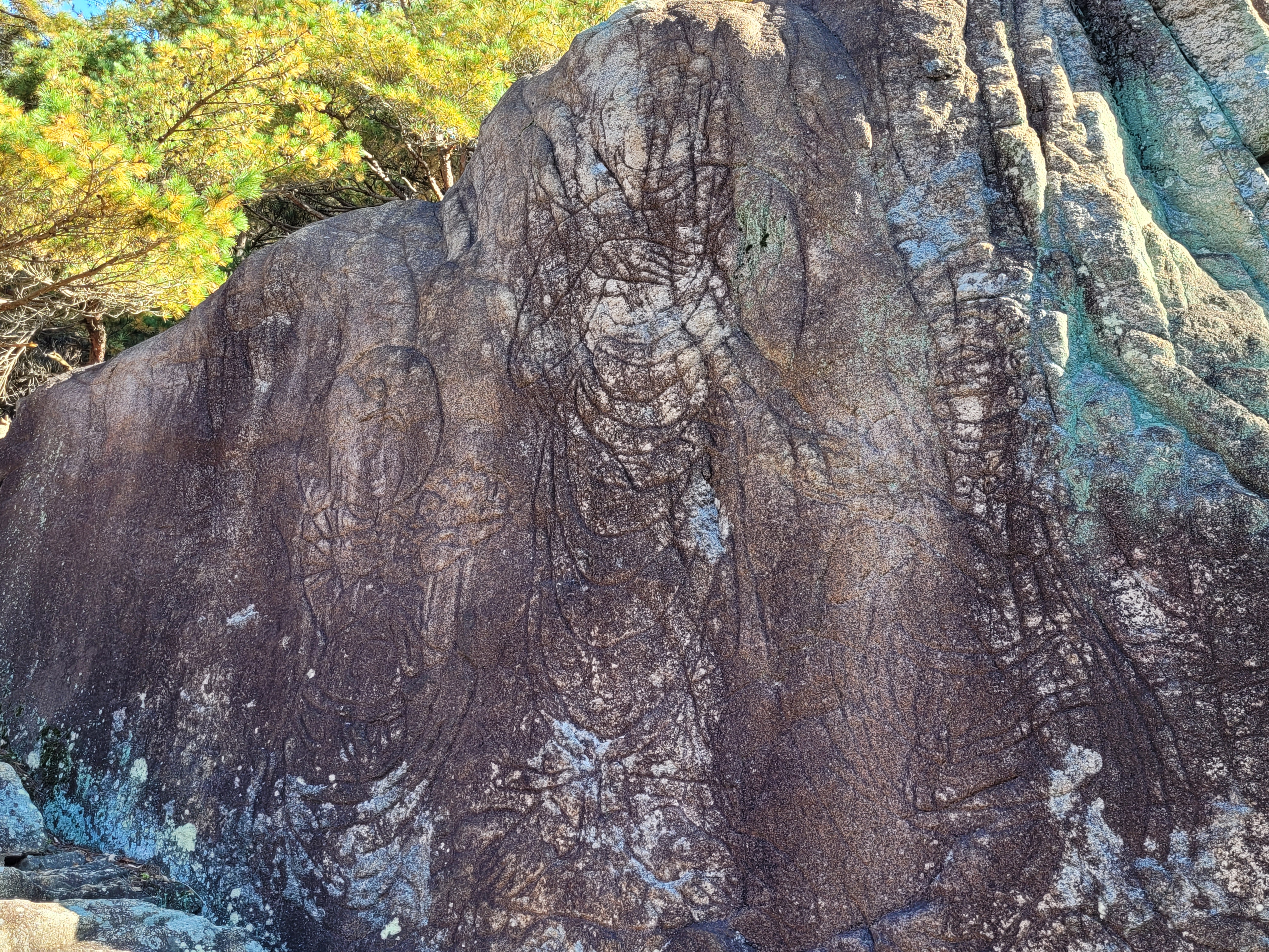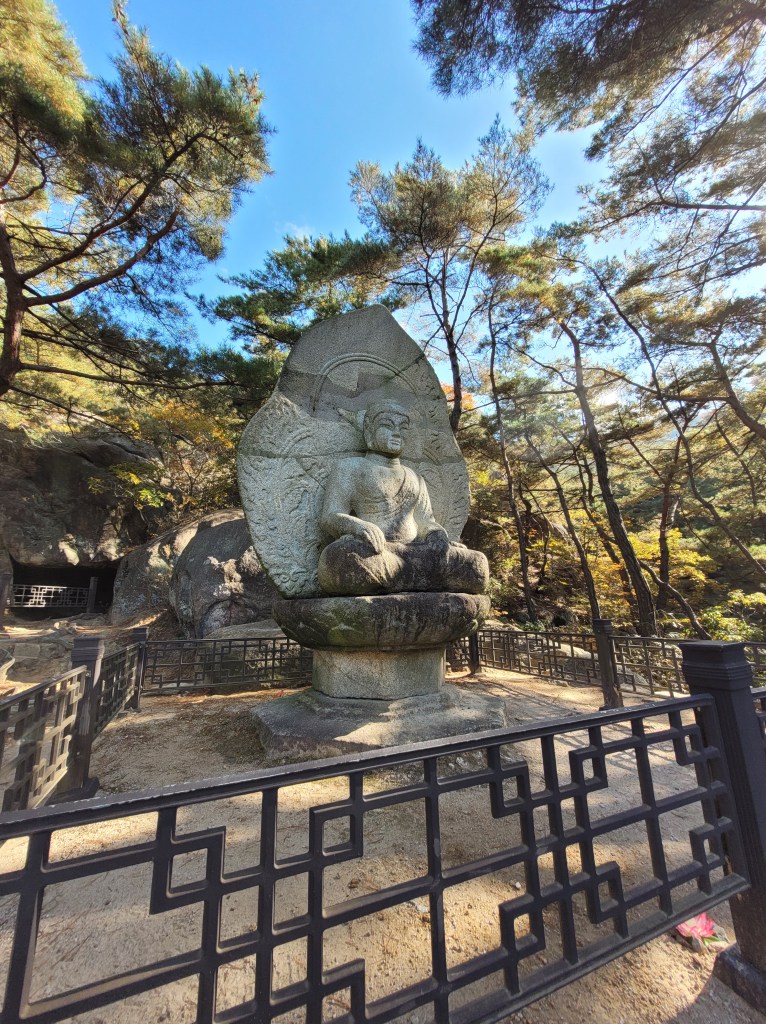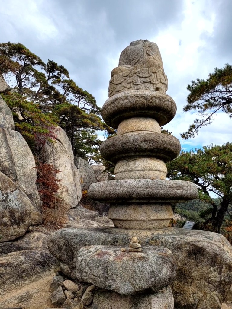 More Buddhas await further up the trail; a stone seated one dated to the 8th or 9th century (the Unified Silla period) and one perched atop a 3-storey round pagoda (sadly headless, but with the added bonus that if you look really carefully to the stone wall to its left, there is yet another buddha carved in the rock face!).
