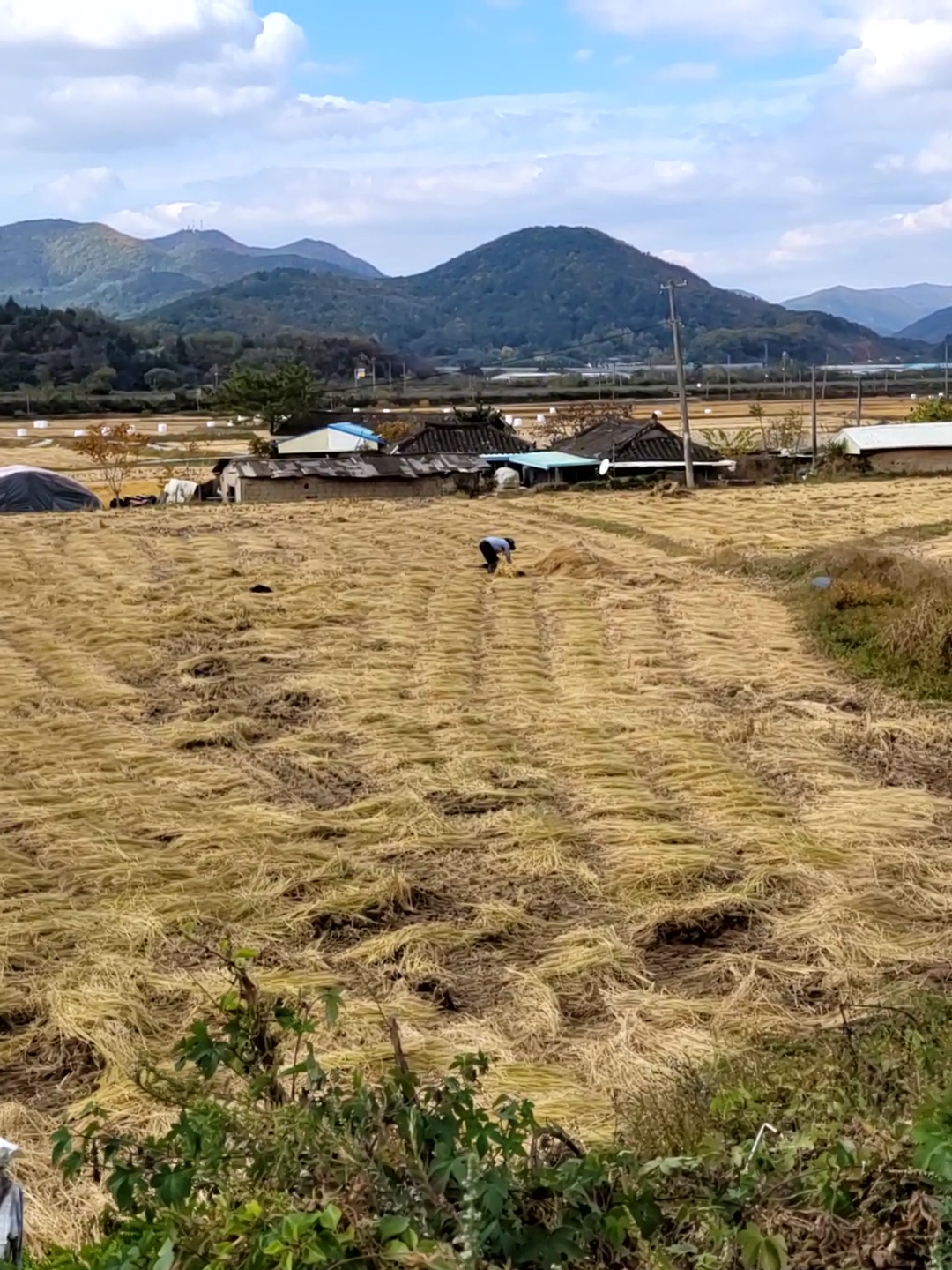Having now travelled around Korea (sorry, I am really behind in my blogging) I can confirm that a vast amount of food production in fields like this one is done by hand. And mostly by an aged population – old men and women working on their hands and knees in the fields cutting or pulling crops, gathering and tying them, or picking fruits from trees and shrubs. I have only seen a couple of machines, small tractors and what seem to be small ridable rotovators. This has, and continues to, surprise me. Either this is the actual way that agriculture is carried out in Korea, or I have totally missed the vast swathes or arable production in the country.