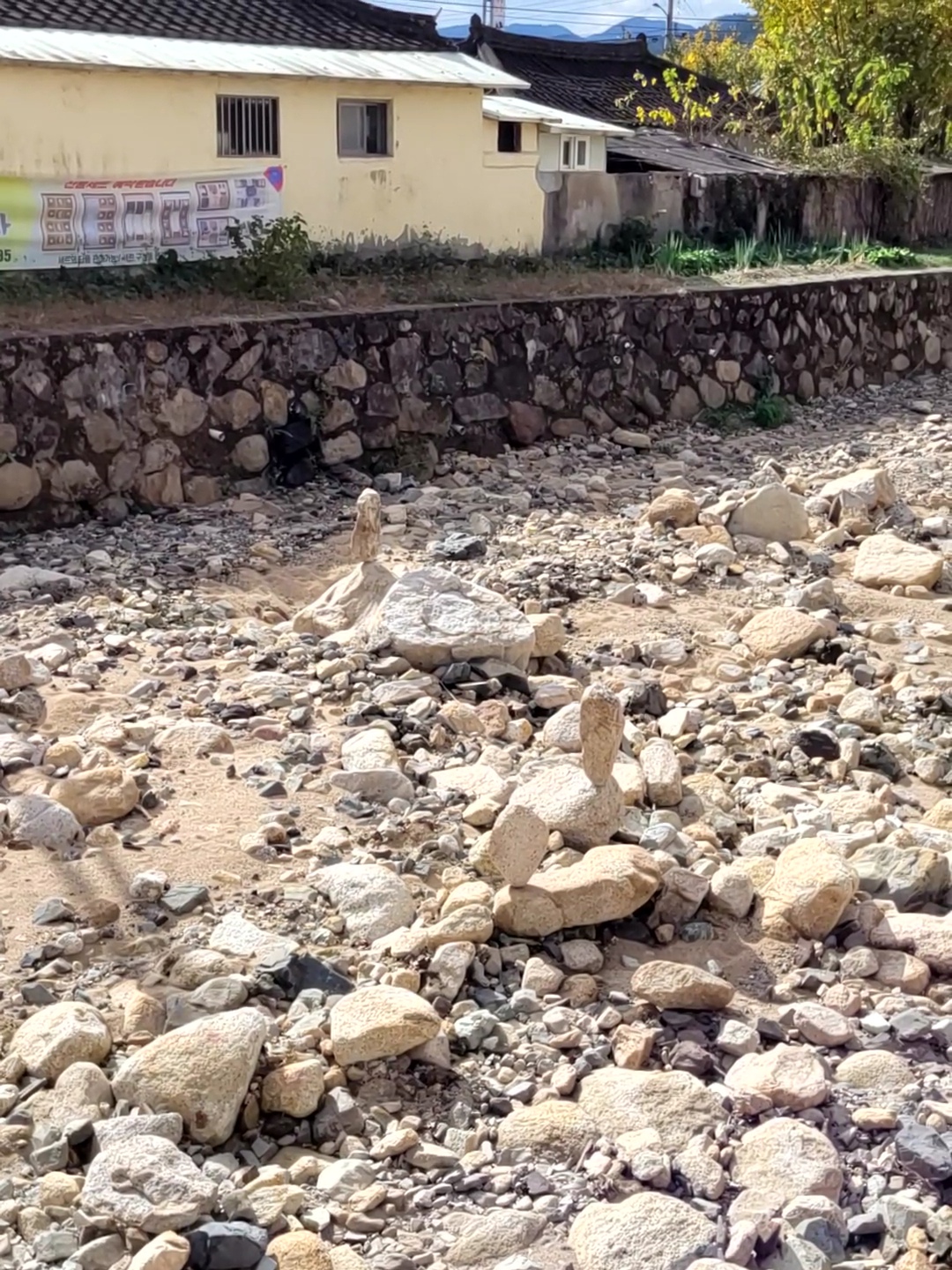I don’t mind this at all. I get to look at houses. I get to be bemused by this river bed in which someone has balanced stones in the oddest fashion that is actually quite spooky. I discover that this area has a large number of new hanoks being built which look to be for holiday rentals.