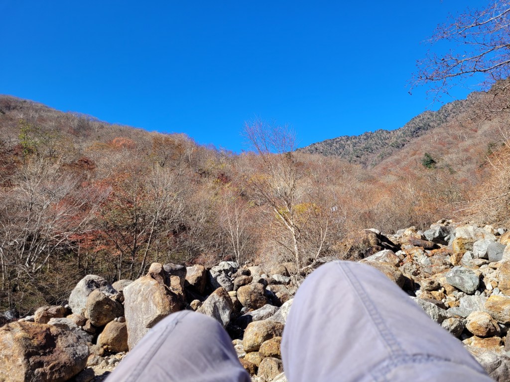 It’s a fair request and so I stop mid boulder field and fling down my pack followed by my body and just lay there among the rocks and look up at the mountain I have just traversed. I close my eyes for a bit. A little bit of the β€˜couldn’t care less’ Korean attitude might be creeping in, because when I hear other people coming down the trail, I simply ignore them and keep laying prone on the rocks, to which of course they don’t bat an eyelid. That makes me smile inside. Wiping away a little of the British worrywart-ness isn’t such a bad thing, I think. Β