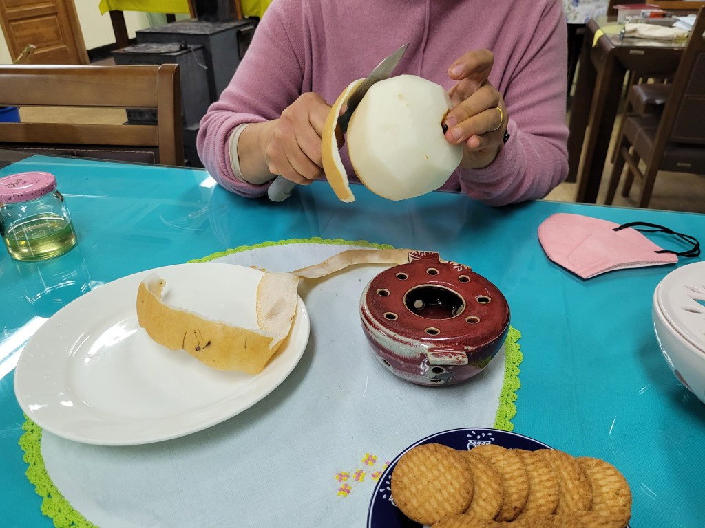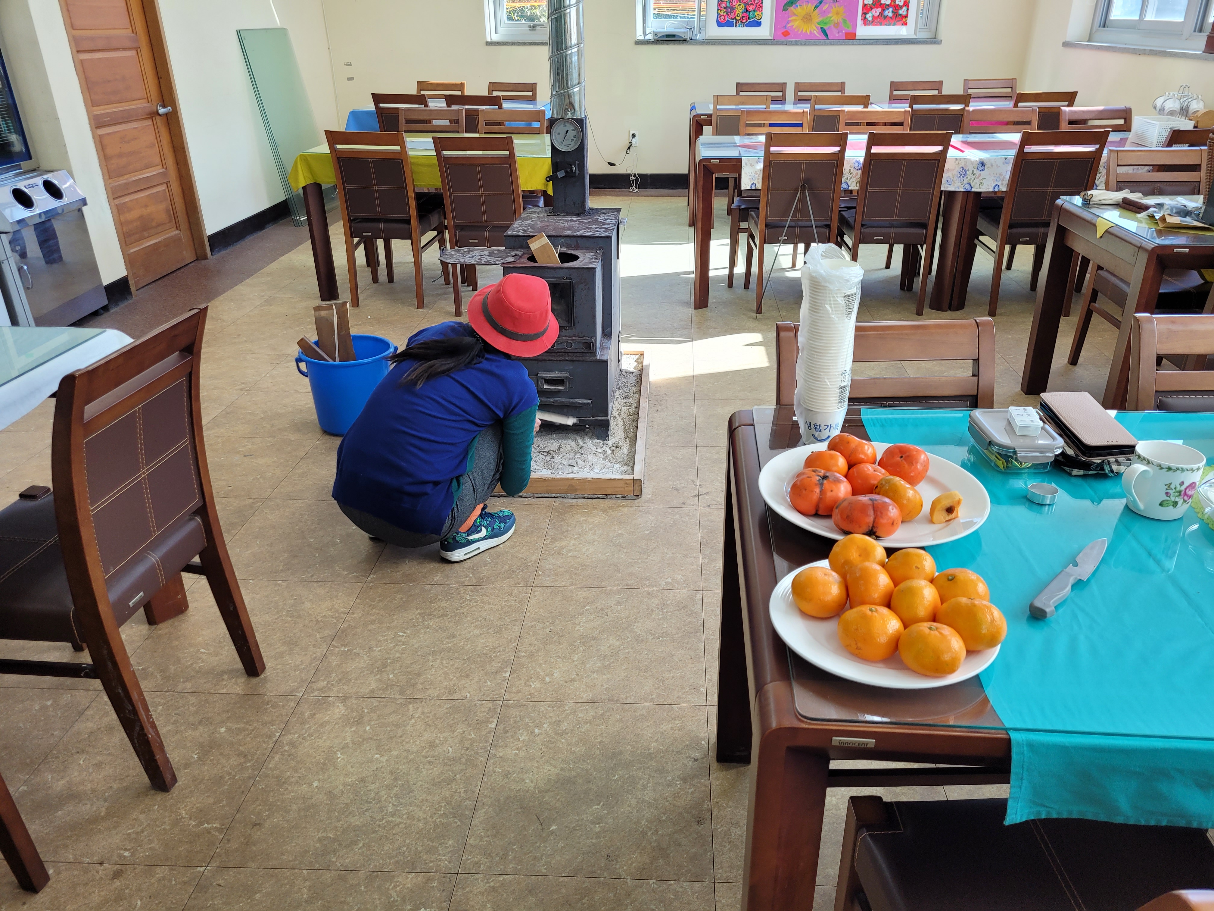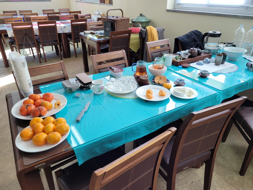 And indeed, here I found two more people (one feeding an indoor wood burner) and a table ready for mid-morning tea at which Mi promptly sat down and started continuously peeling fruit (Korean pear, persimmons, and tangerines) and insisting I eat them. I won’t say no to tea and fruit, and I will also tell you Korean pears are both huge AND delicious.