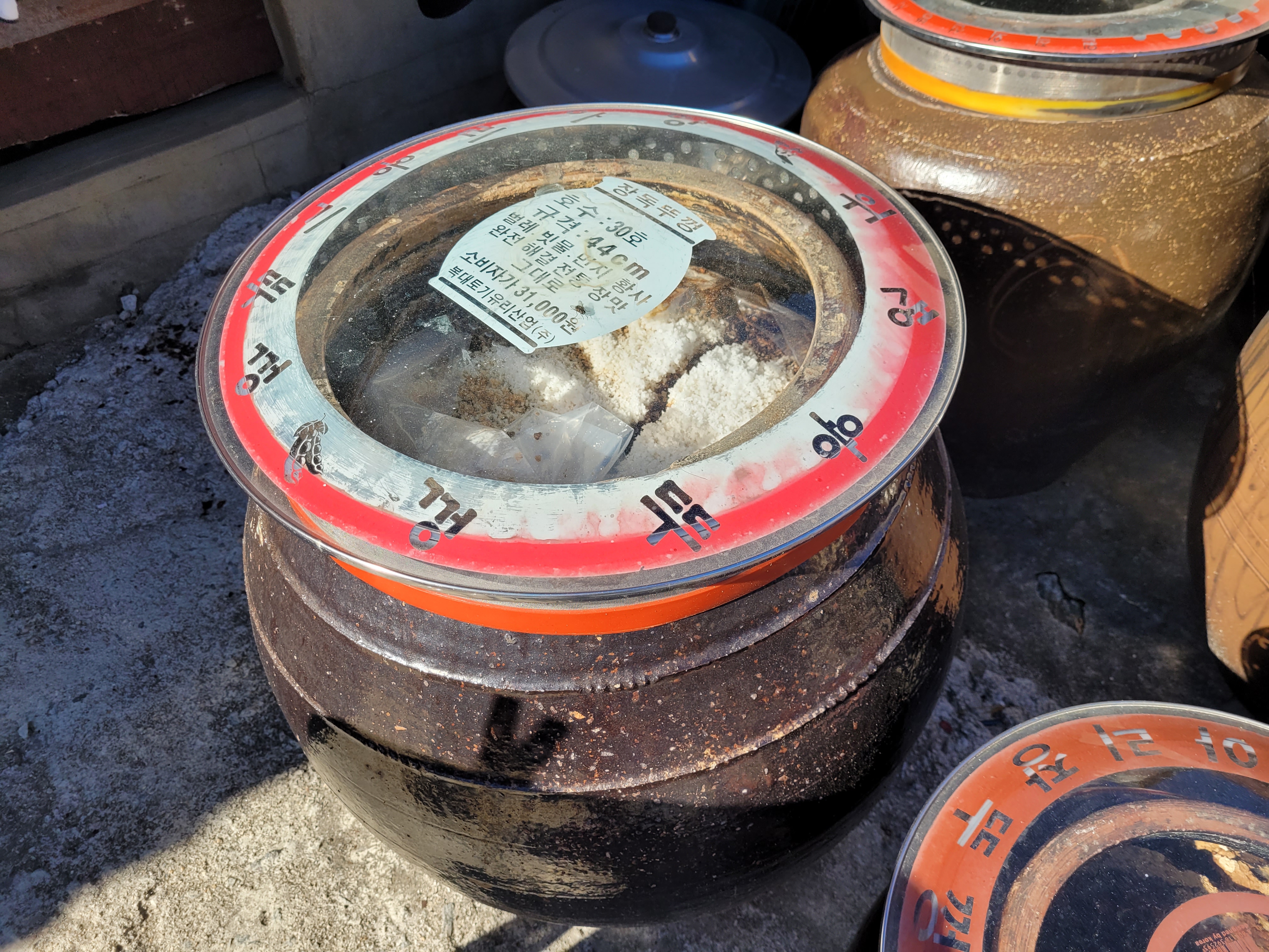 We drove maybe 5 minutes down the road and pulled into a house, obviously belonging to someone Mi was acquainted with, or at least I hope so, because we then proceeded to relieve this person of a whole massive onggi (kimchi earthenware pot) of doenjang.