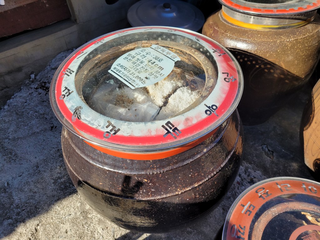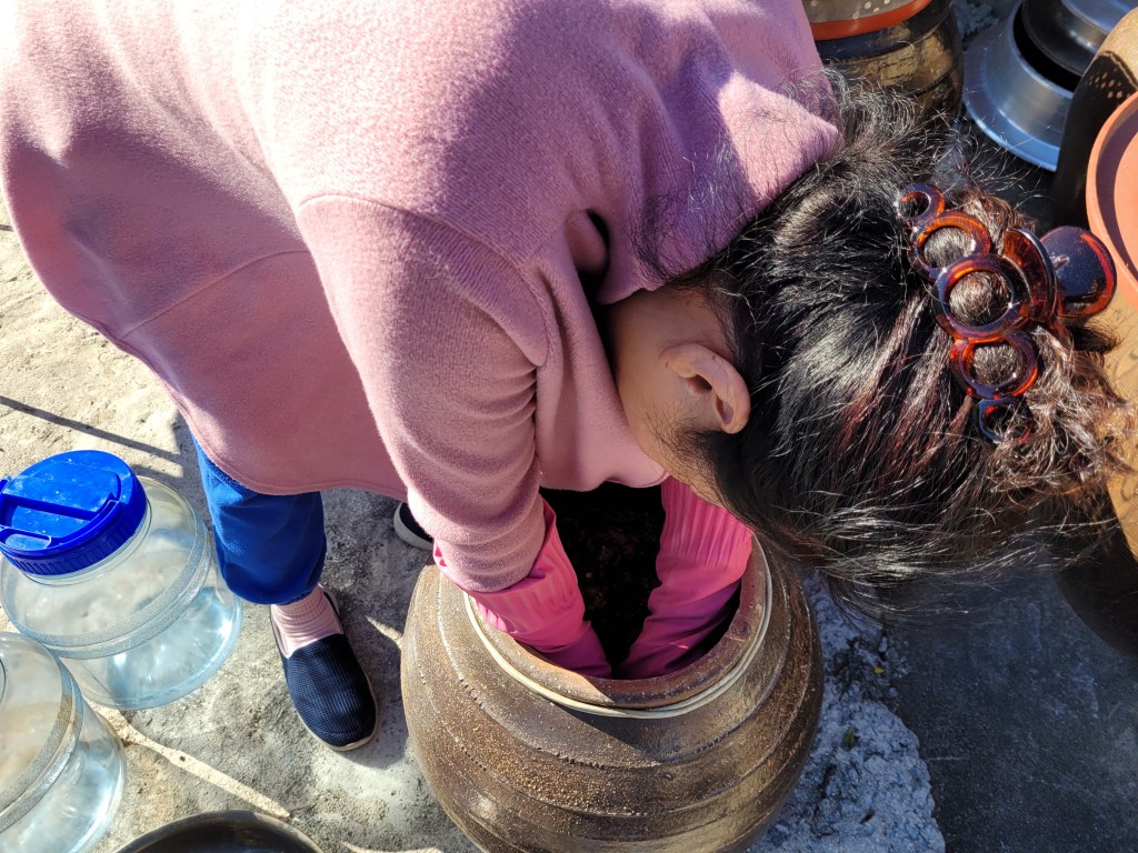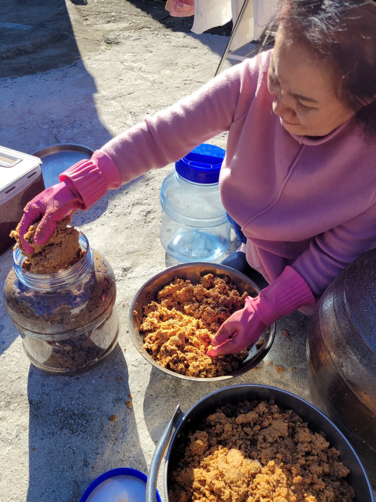 Now, I am not even going to come close to explaining how doenjang is made, because I really don’t understand, but I do know that it starts with soybeans that have been soaked in brine and left to ferment. I don’t quite understand if the doenjang pot has to be filled to start with, or if somehow the soybeans ferment and multiply to fill the pot? I have no clue. But I do know the stuff we were making off with today had been sitting here outside for a year in all weathers and that it was strong and earthy to taste, because Mi fed it to me straight from the pot. I know it’s not to everyone’s taste, but I do like doenjang.