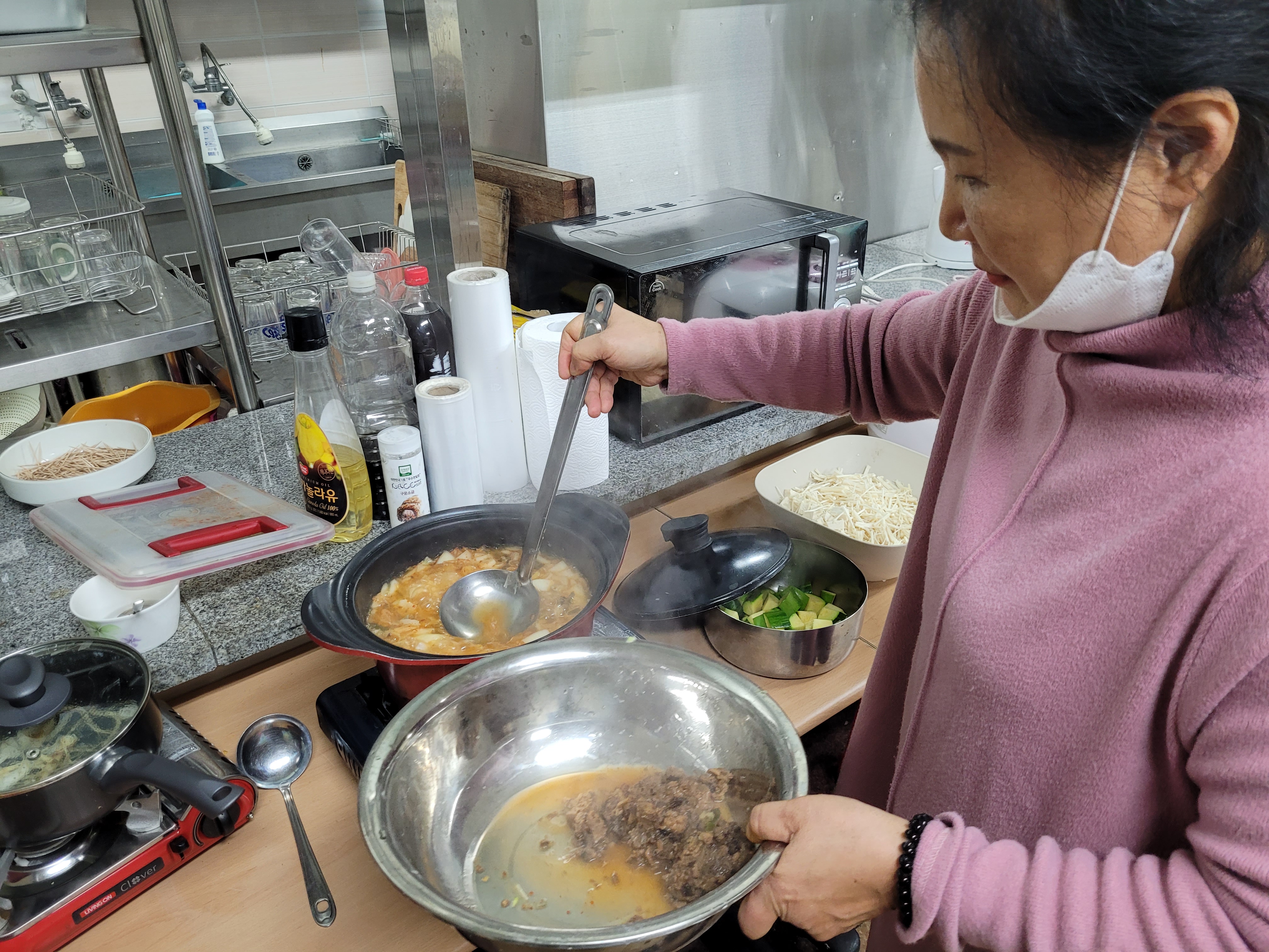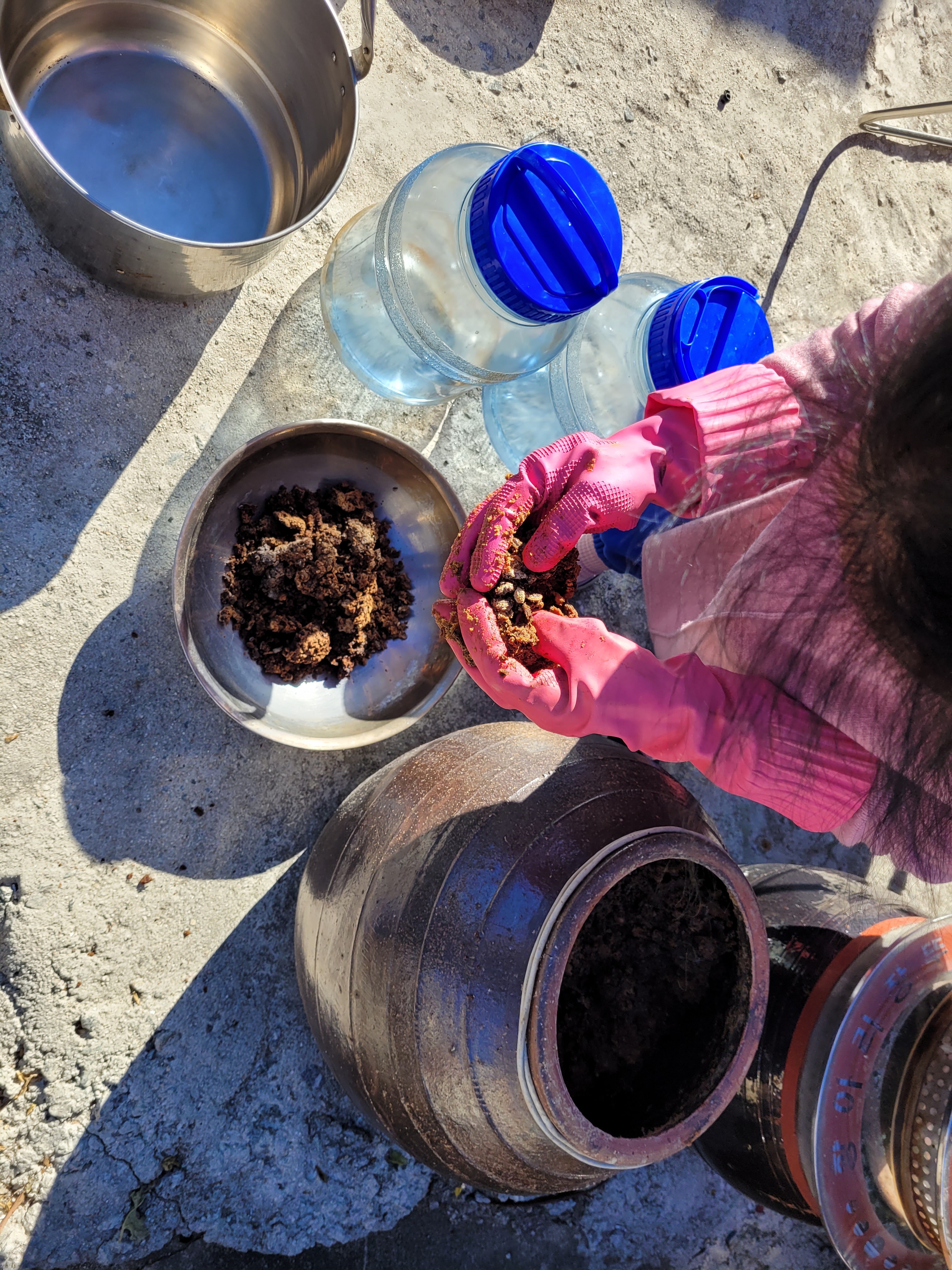 At this point my tiredness started to abate and I was back in kdramaland and having internal fireworks, having seen these pots plenty of times on TV. Mi removed one of the lids and immediately the air began to smell of fermented paste (for that is what doenjang is, fermented soy beans).