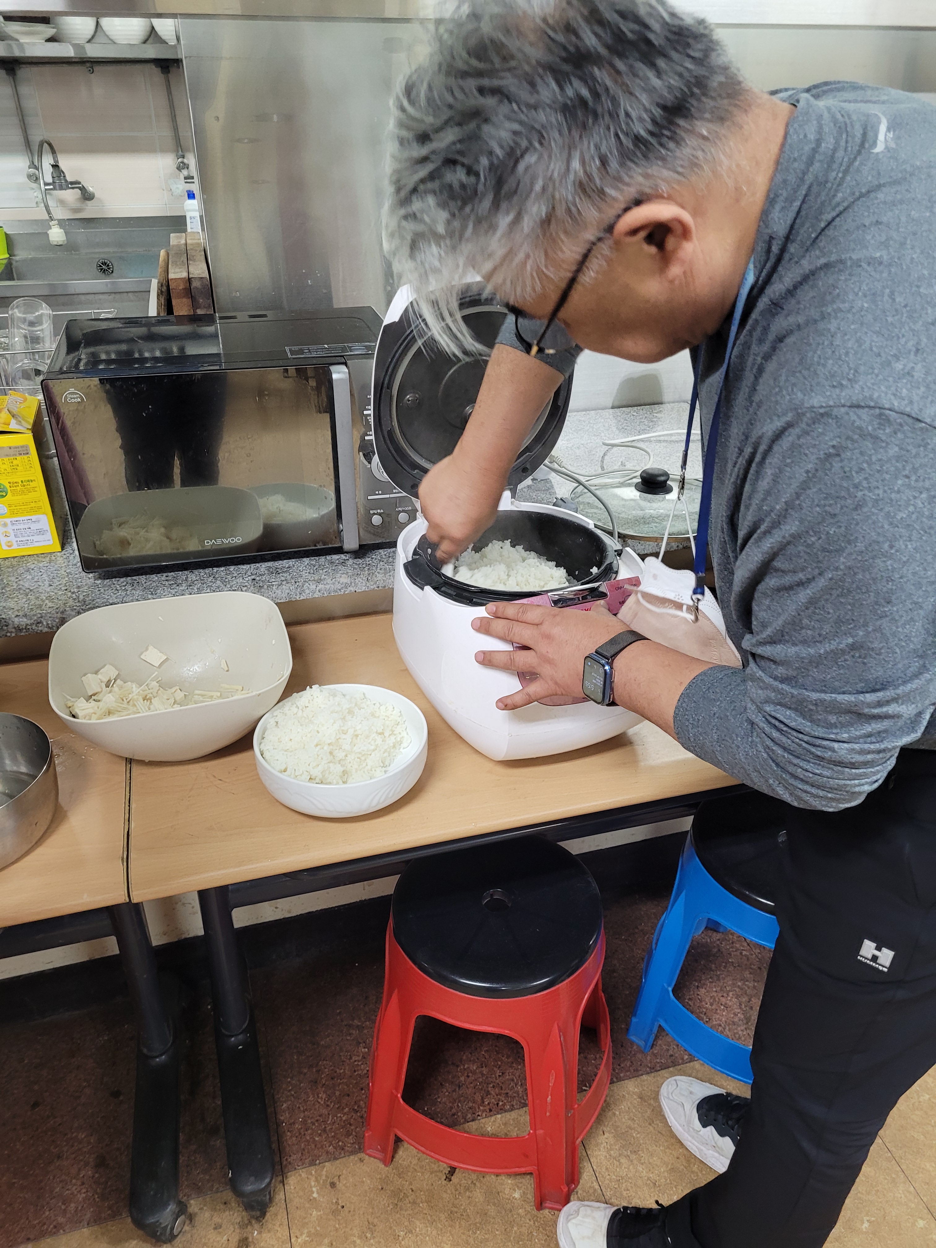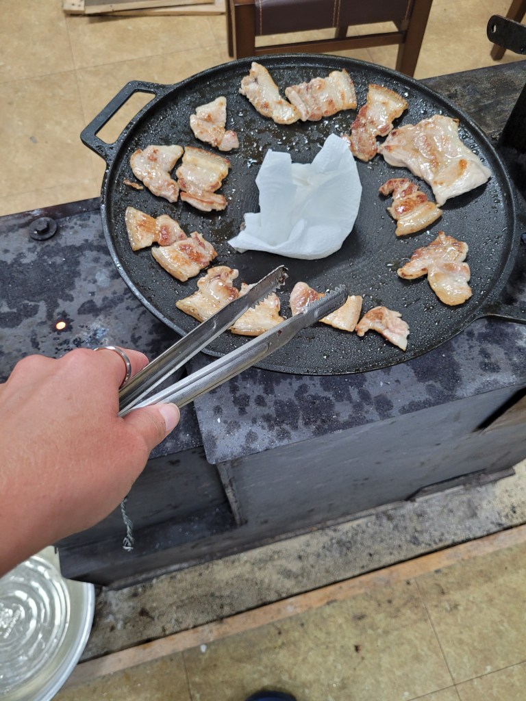 I am handed vegetables and told how to chop, I am taught how to correctly clean rice and use the rice cooker, I am shown that the rice water is used for the jiggae base and instructed when to add each vegetable and how to create the deonjang paste. I then get to try my hand at cooking meat (samgeopsal) which is incredibly daunting and exciting all in on go.