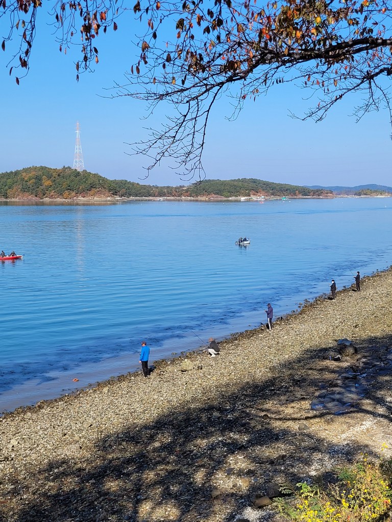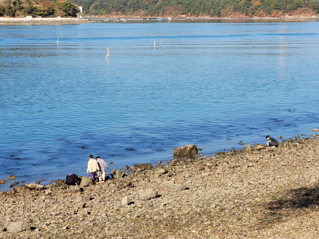 Adults and children are combing along the rocky shoreline. From what I can tell, they are gathering some type of molluscs. Slightly further along, a row of gentleman are fishing from the beach. And this is something that I have noticed here in Korea, people gathering and harvesting food items from the wild.  I have regularly spotted people on my walks through the cities or on hikes in the mountains scrabbling through the leaves on the forest floor gathering acorns. Not a practice I see that often in the UK, maybe with the exception of blackberry picking, and it makes me happy to see people making use of the natural resources here.