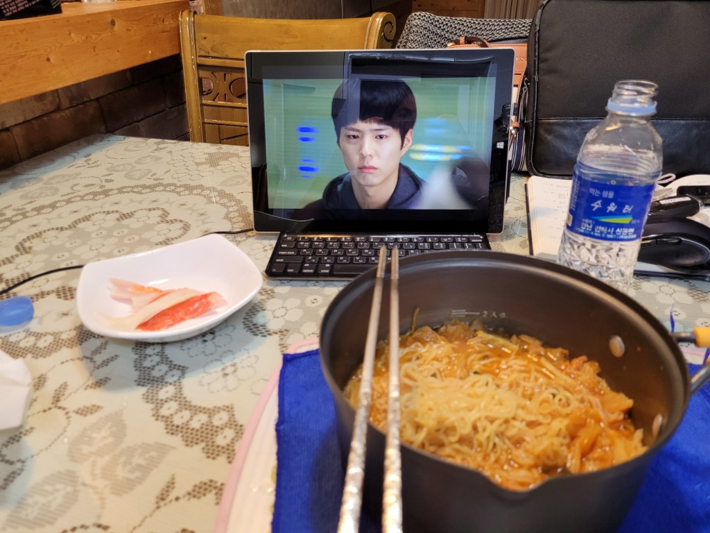 First Namhae dinner – kimchi ramen, king crab sticks, and a sad Park Bo Gum (Reply 1988 – awesome drama)