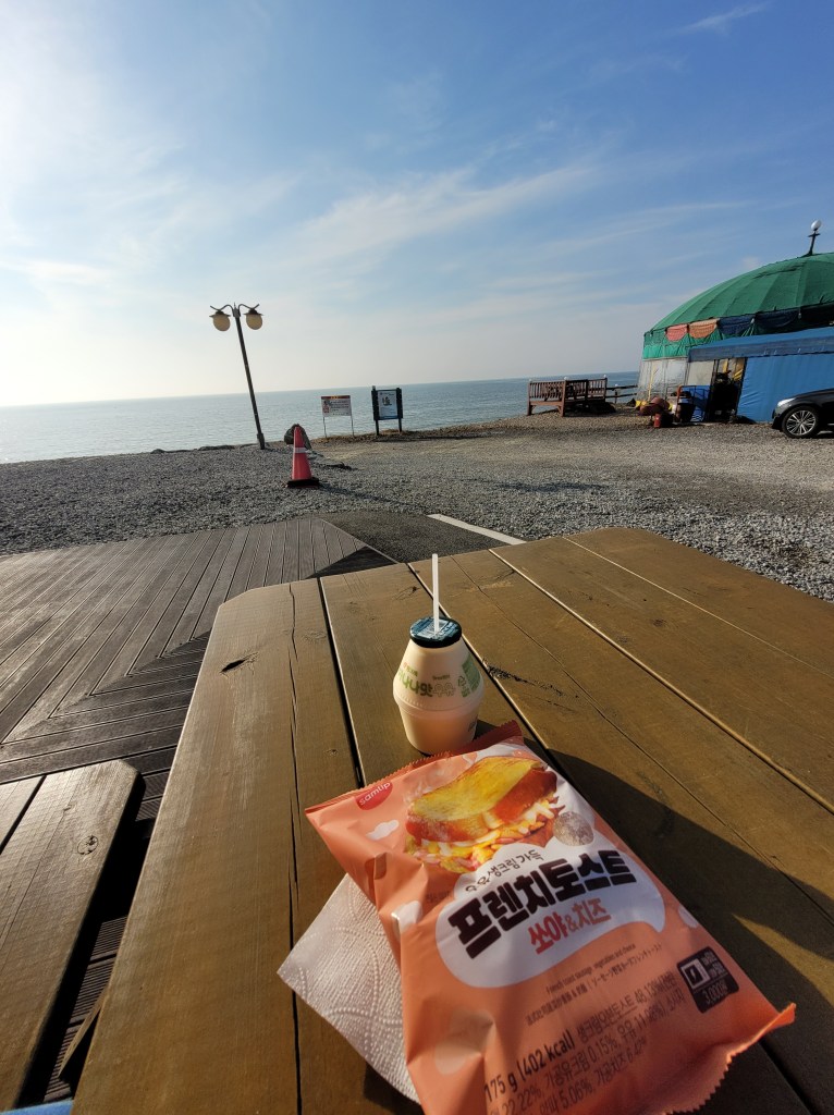From my starting point I go from Kkotji Beach to Bangpo Beach, from nice yellow sand at Kkotji to more sand and pebbles over at Bangpo. I stop to have a convenience store toasted sandwich at Bangpo, making this the first time I’ve used a microwave in a shop (obviously very exciting to me), and some banana milk (yes, this is an addiction). Bangpo, I am very excited to find, is covered in sea glass. Well, when I say covered, it isn’t covered, but you know, there’s a fair amount to spot. This is exciting to me as I have been charged by my friend Flea to collect some sea glass while I am here for him to use in his crafting at home. Usually when he and I go glass hunting, I am useless at it. Worse than useless really. I can’t spot the stuff no matter how hard I try. But here at Bangpo, I come up trumps and am very pleased with my haul.