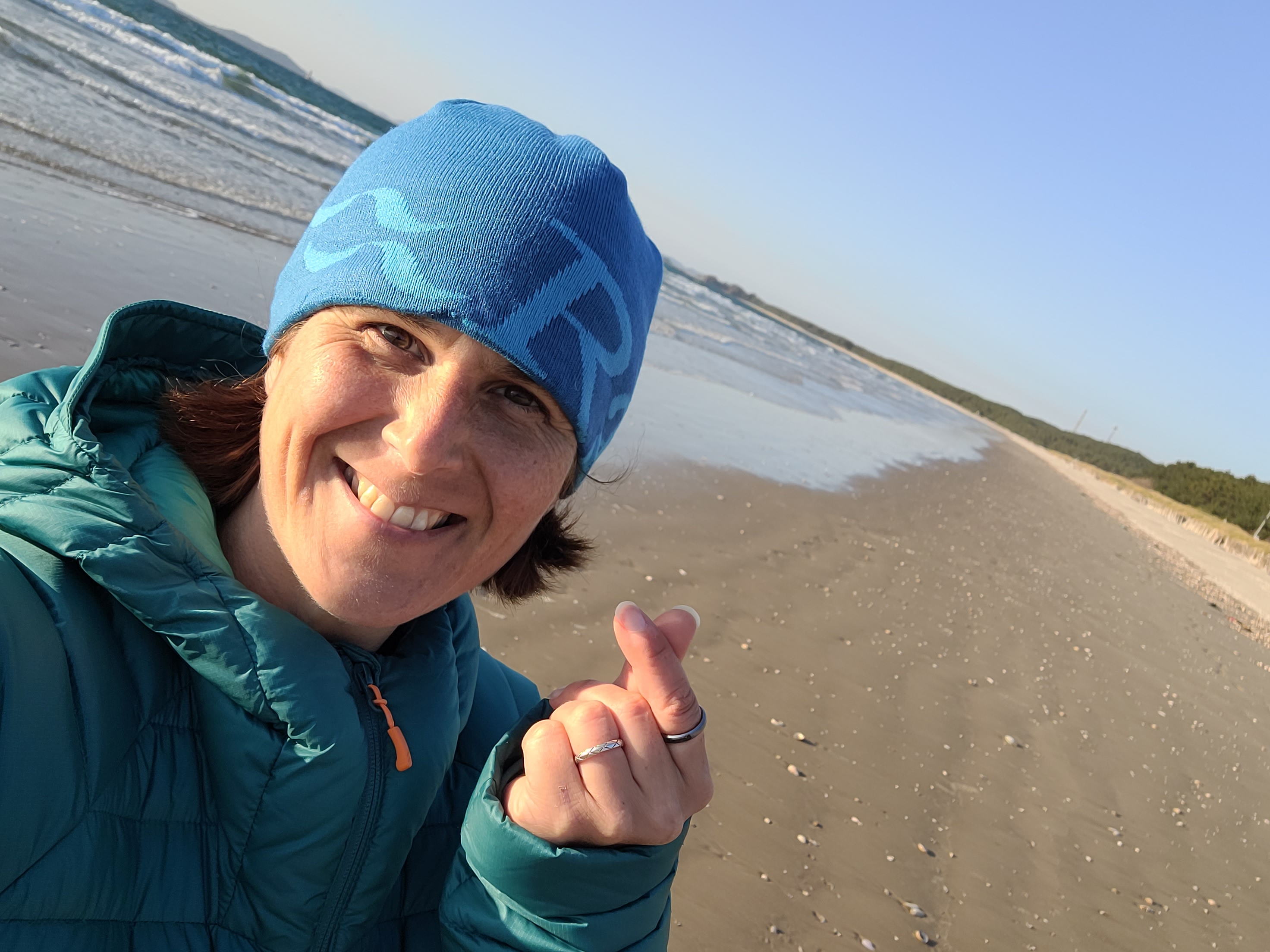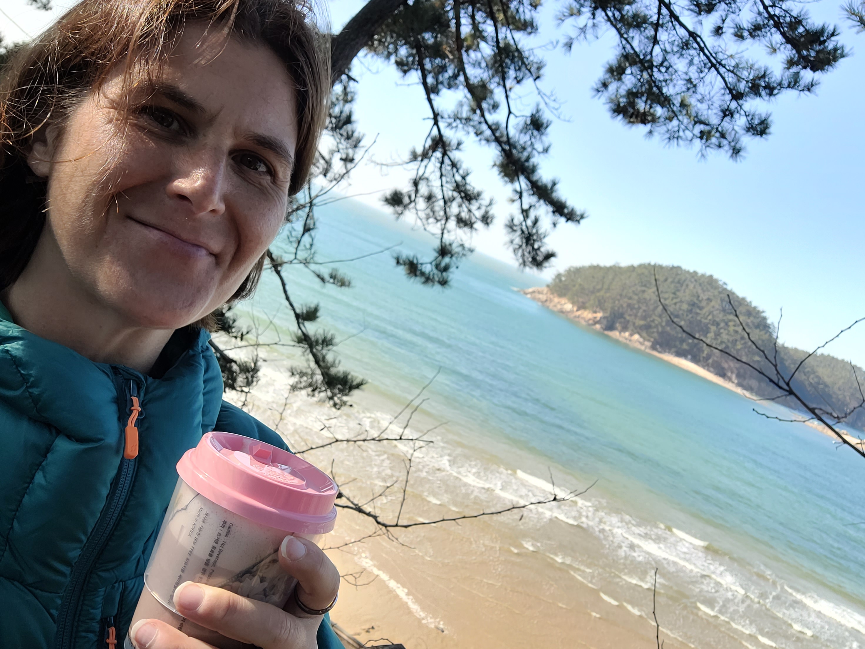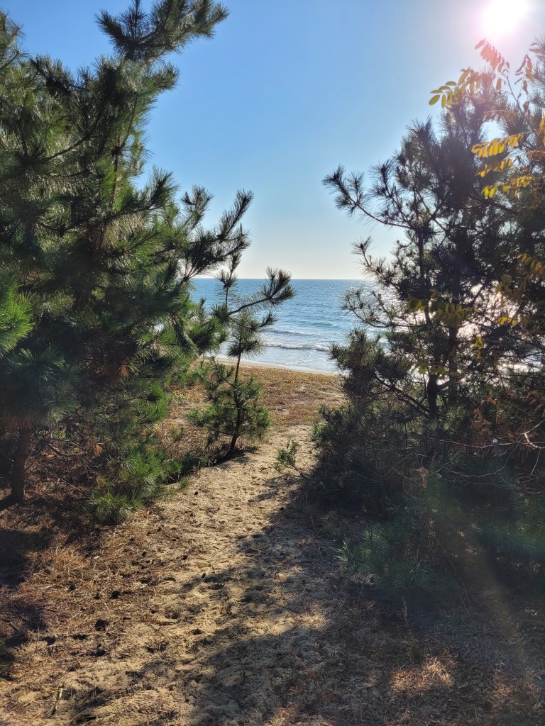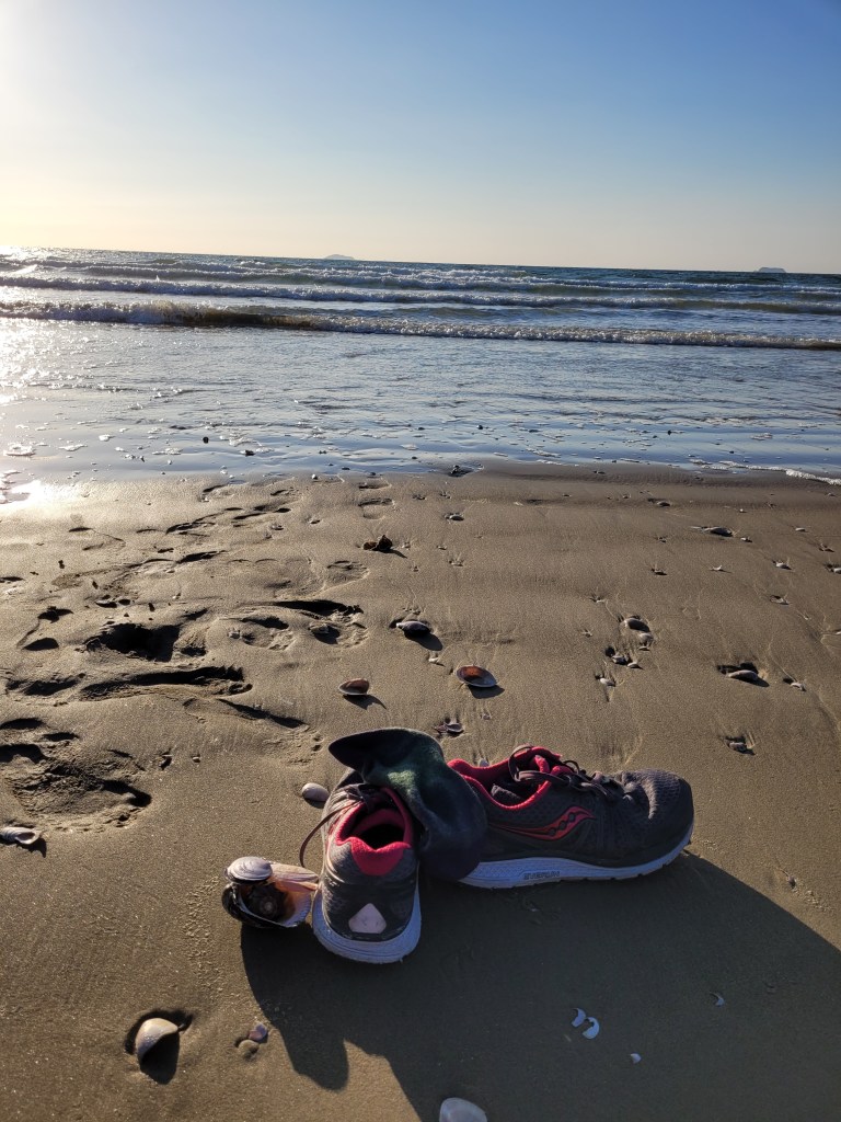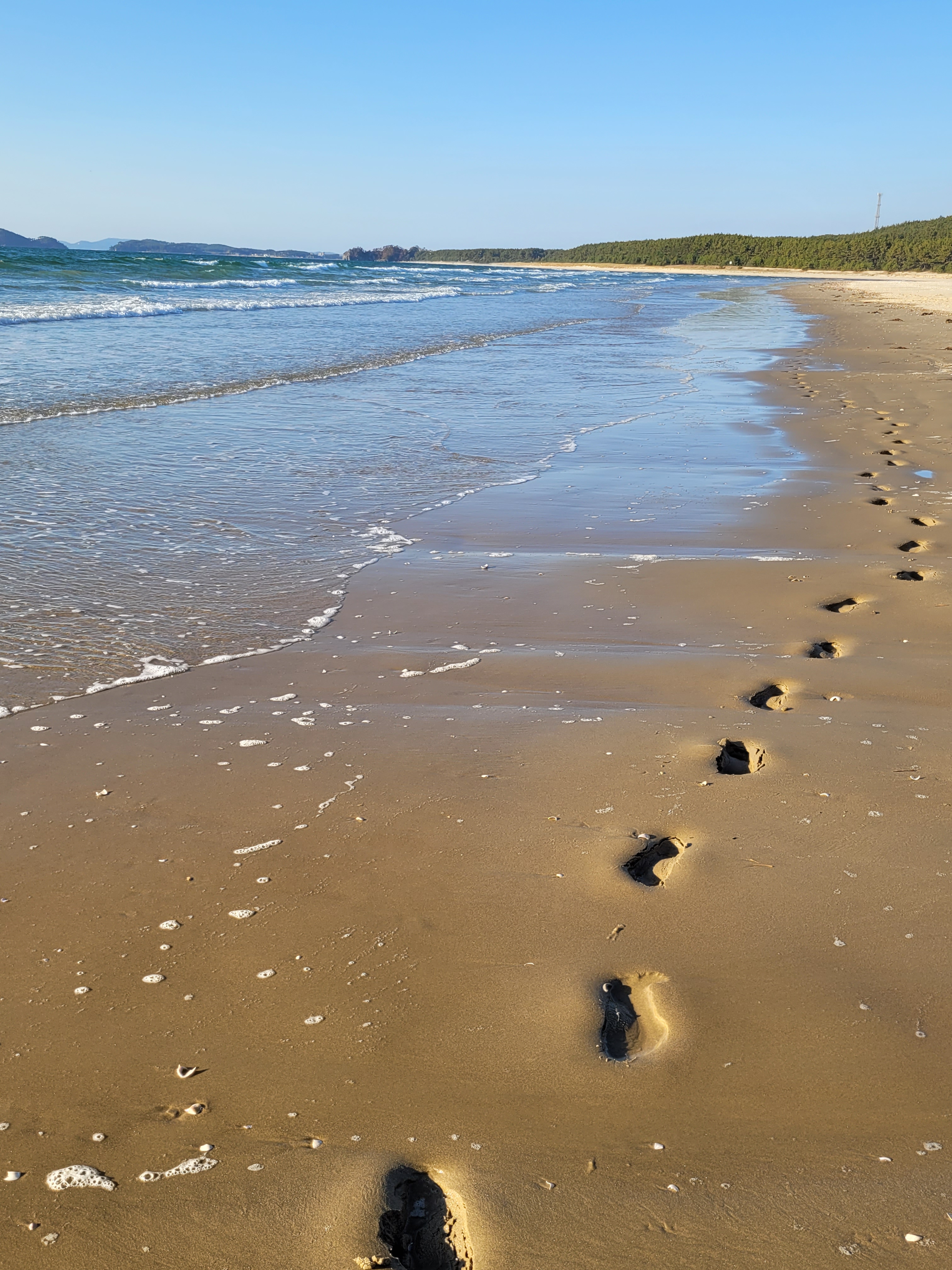 There is no-one here at Anmyeon. I passed one lady as I started walking the trail early today, but apart from that, I have had the whole path to myself. When I reach the main beach front and discover it empty, well, that’s just perfect for me. I kick off my hiking shoes and let my feet enjoy the soft cool sand. This beach is the very definition of picturesque. I alternate between splashing my feet through the slightly chilly shallows, walking the harder packed sand near the rippling waves, and beachcombing in the softer loose sand higher up the beach.