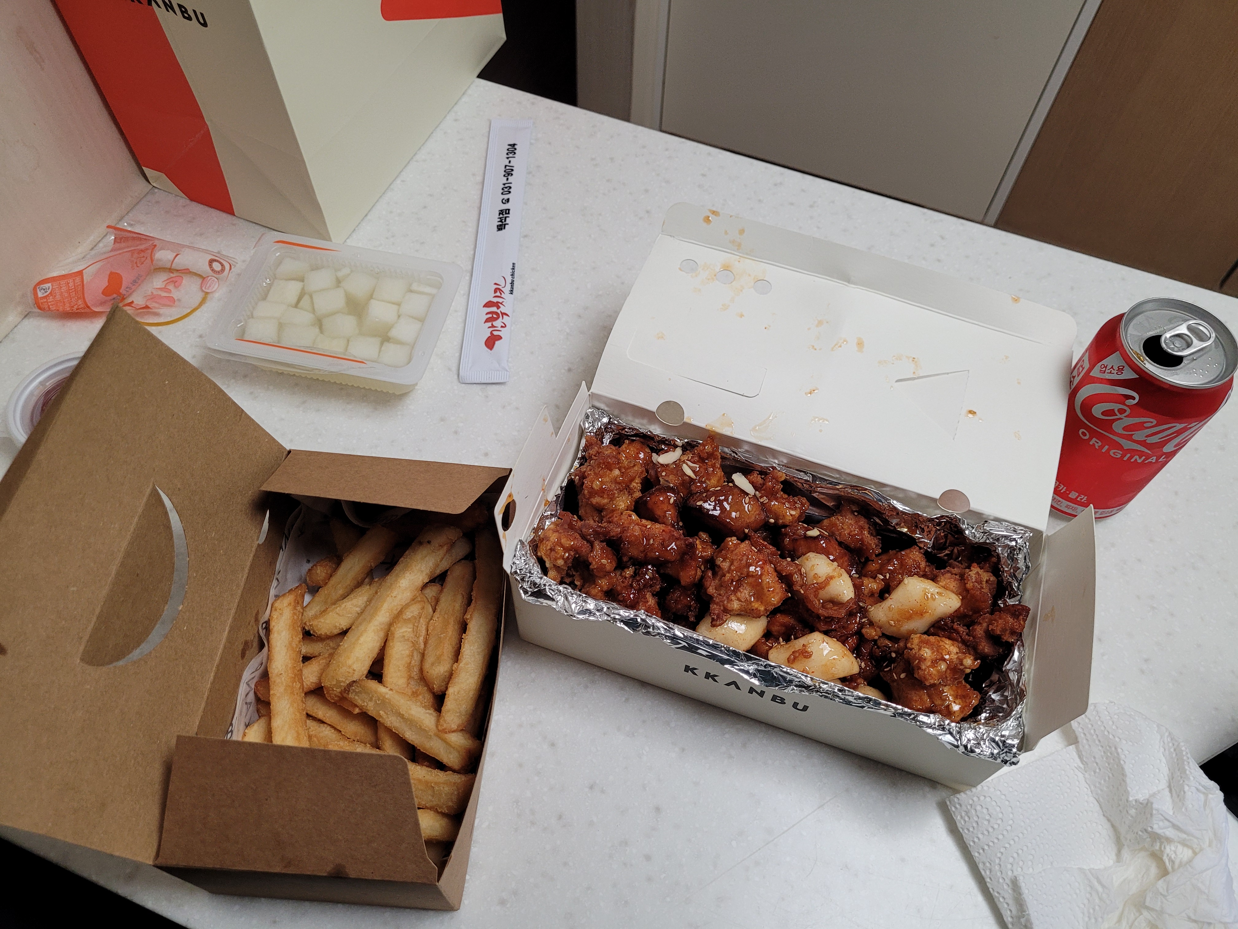 I have just two things to say about my meal in the interest of public service. First, the chicken from Kkanbu Chicken near the Goodmorning Hill apartments is absolutely, no complaints, mouth-wateringly delicious. I was surprised when I opened my box to find there was tteokbokki mixed in with my chicken, but fully support this culinary decision. Additionally, the orange-tinged sauce they include for your fries tastes scarily close to the addictive Chik-fil-A dipping sauce, again something I am very happy to find out.