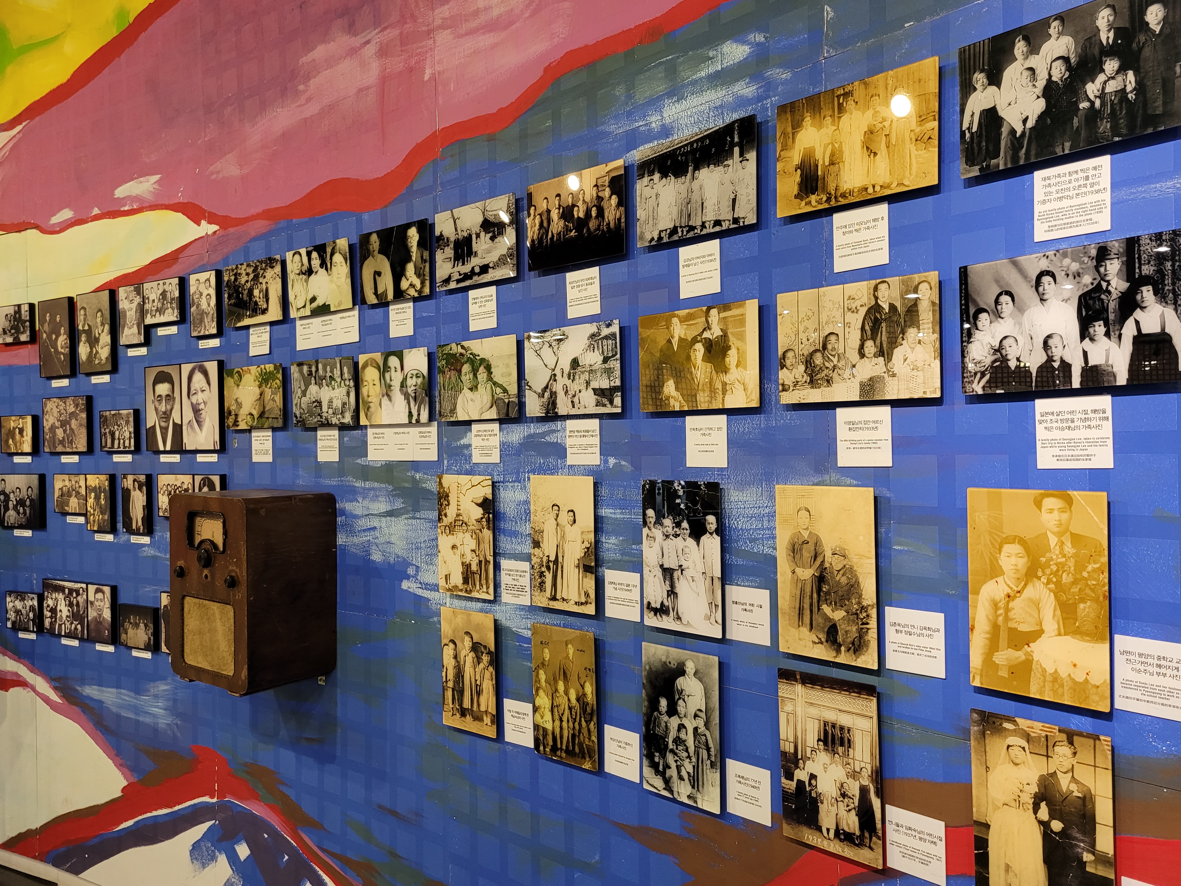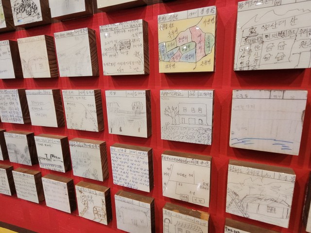 The two exhibits that have most impact however are the Displaced Families and the My Hometown collections. The first is a room full of photographs of families that have been split across the two countries and have not been able to see or contact each other since the division. The second room is covered in small tiles containing illustrated or written memories by people who were forced to leave their homes in the northern part of Korea when the war began and have not been able to return home to their hometowns.