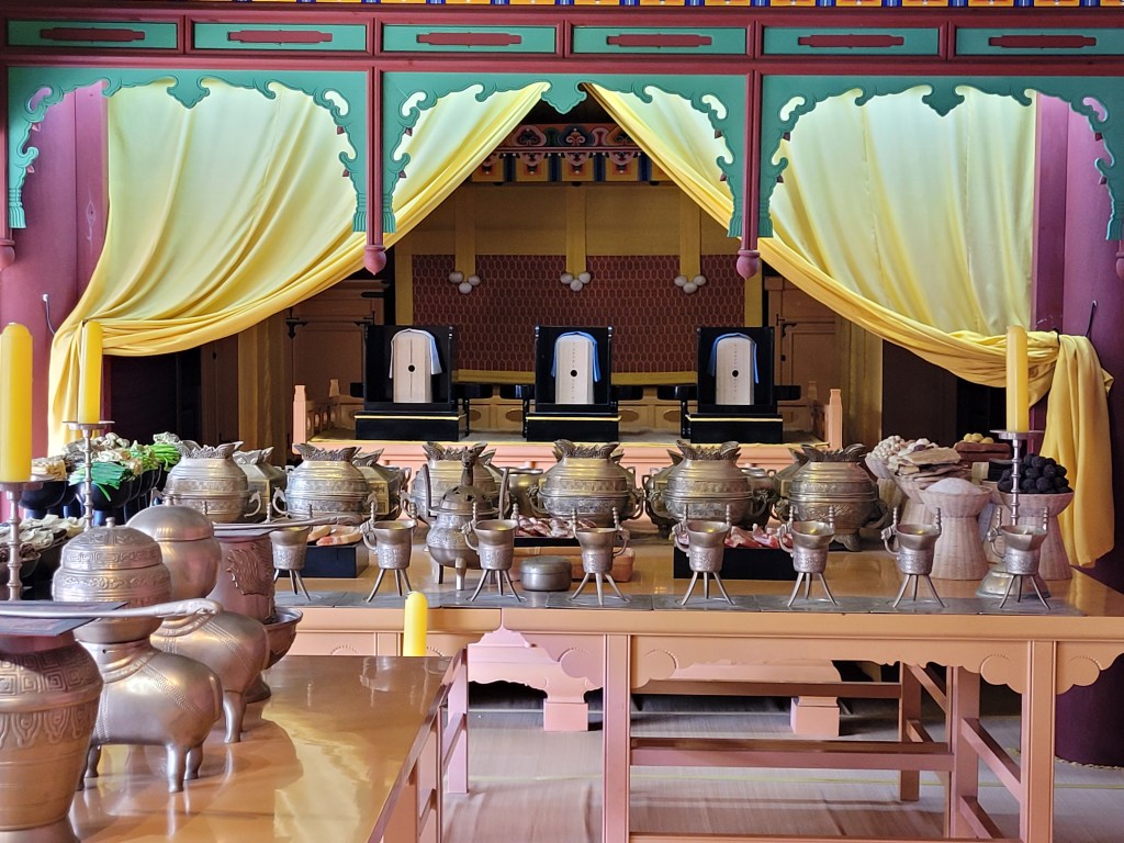 It is this annual memorial rite that is still performed for the royalty within Jongmyo Shrine. Instead of the photos used today, the names of the kings and queens were written on tablets and it is these that are displayed on the table with offerings.