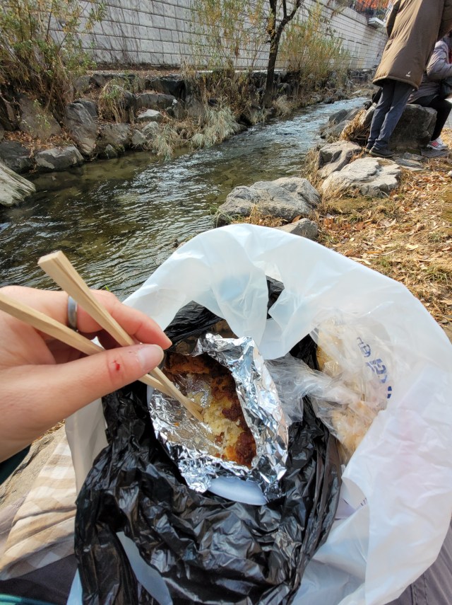 And as if I am throwing all caution to the wind, with my pancake securely stowed away, I march on down to Cheonggyecheon Stream, sit on a rock and proceed to eat my mungbean prize.