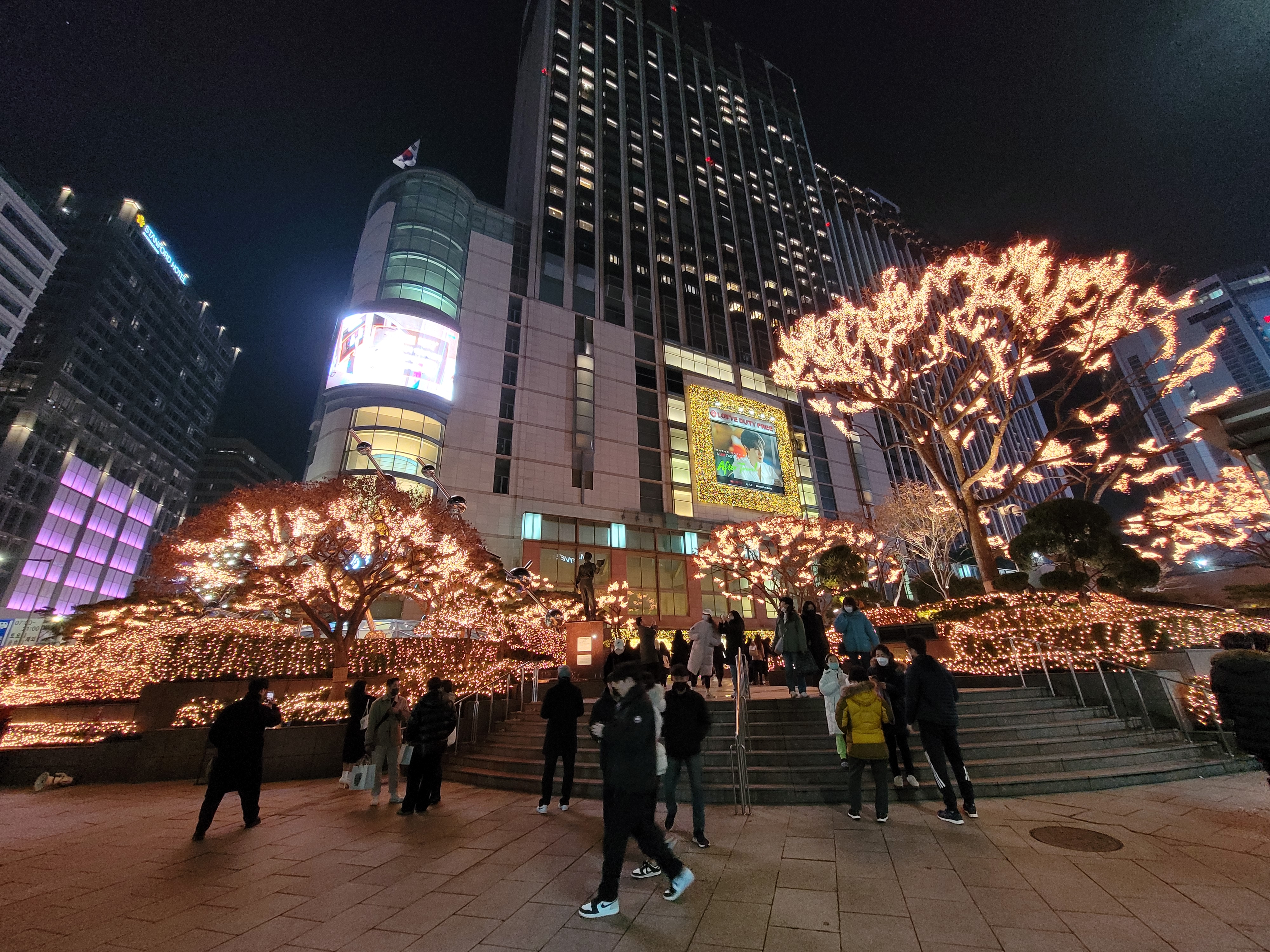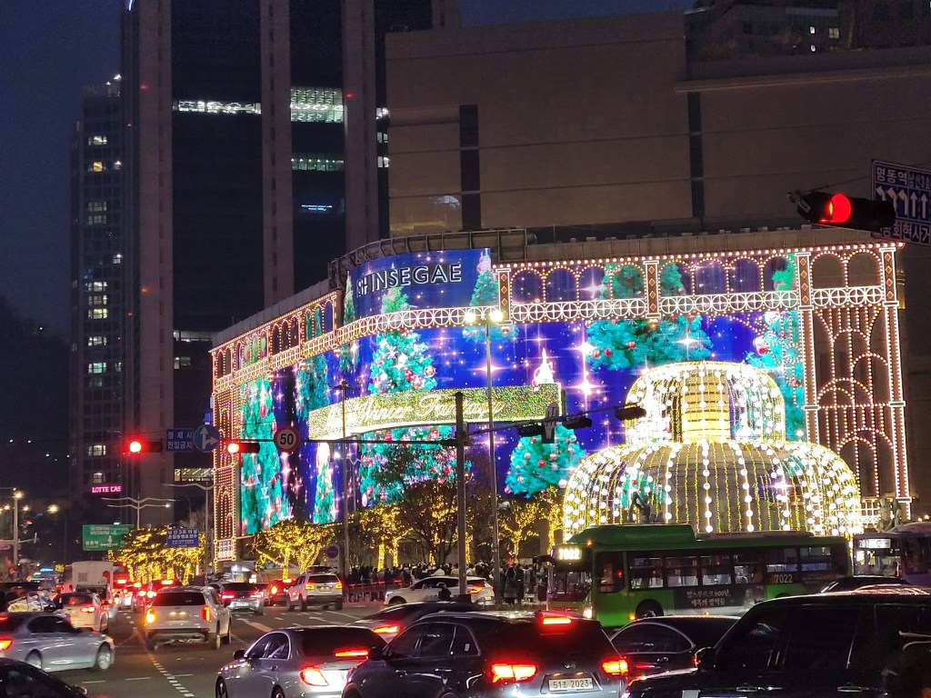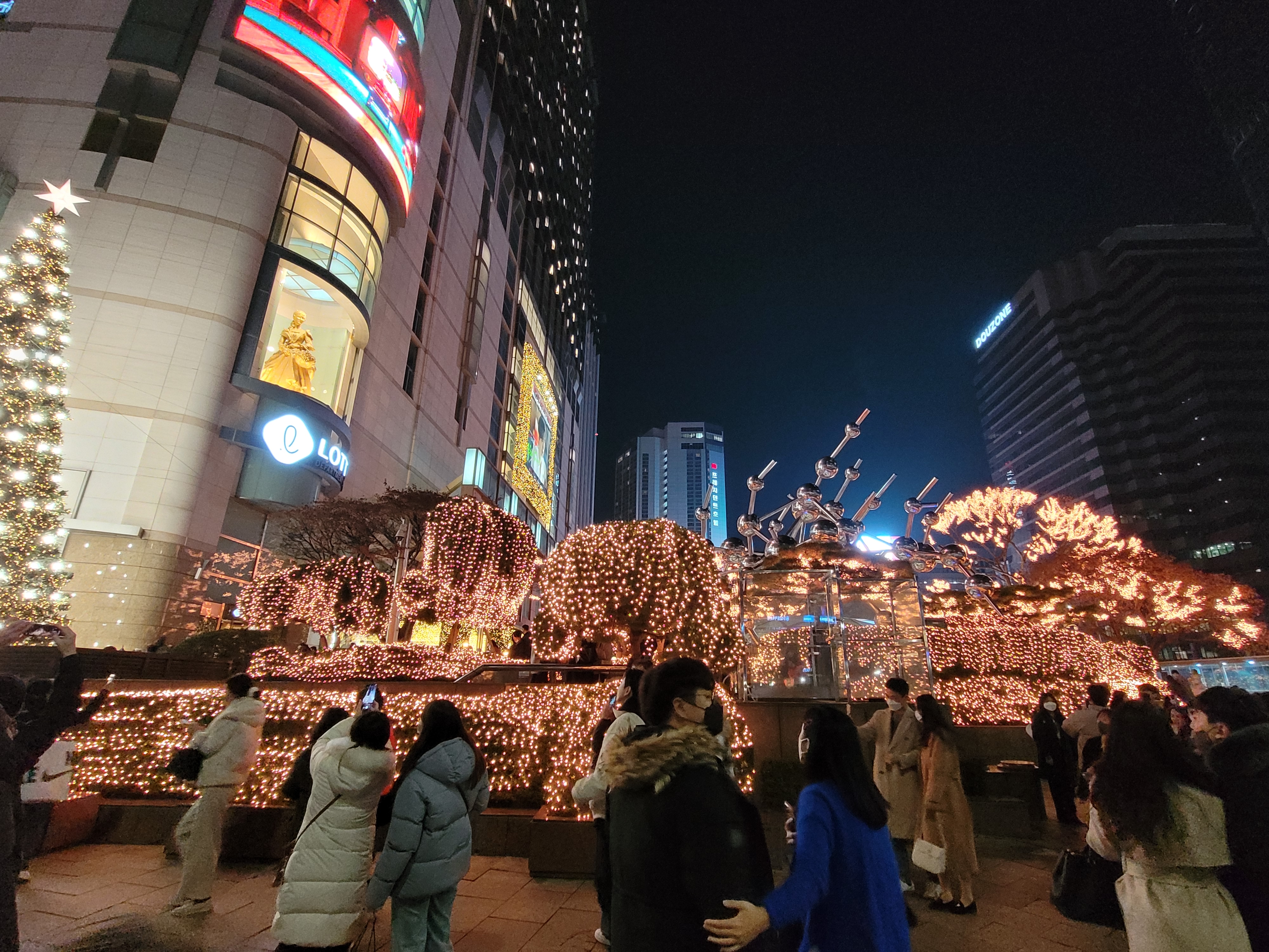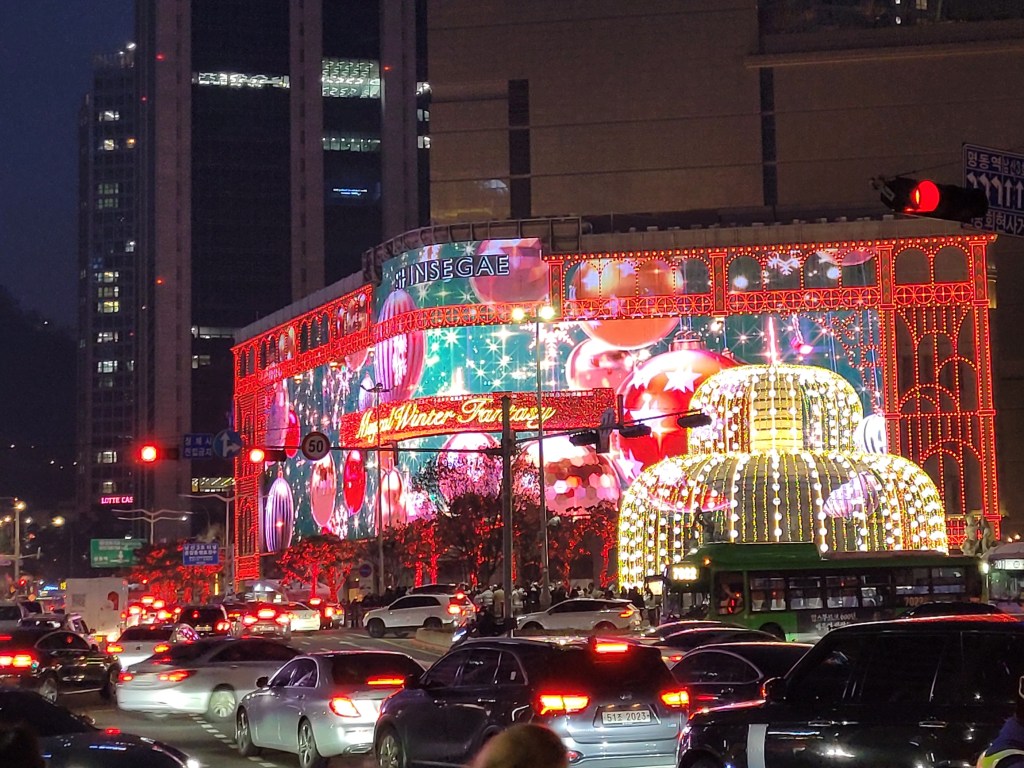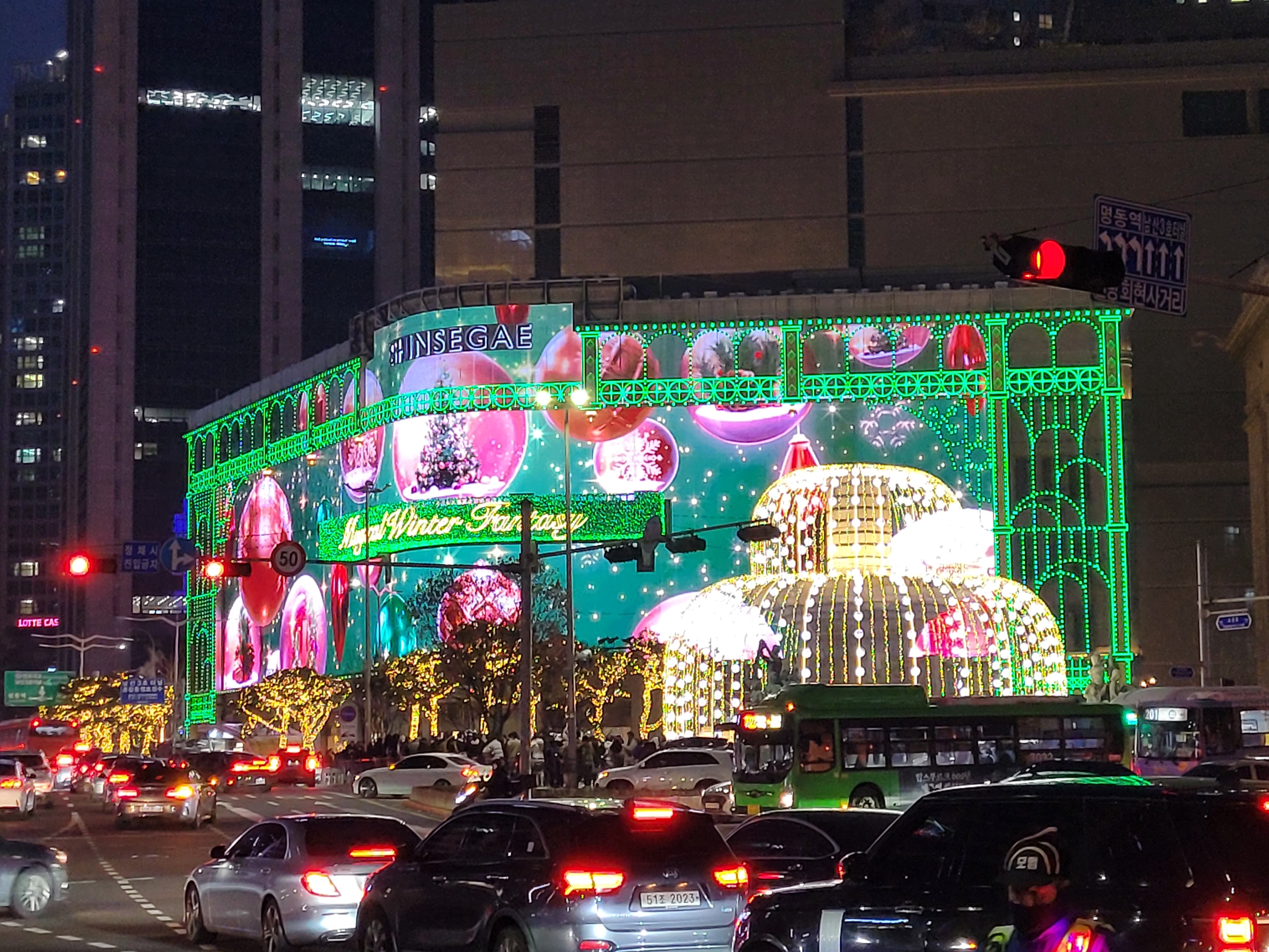 Shinsegae Department Store is where the night time action is during the holidays, the whole front of the store lights up with a moving display and people flock here and hold up the pavements and roads watching the display.