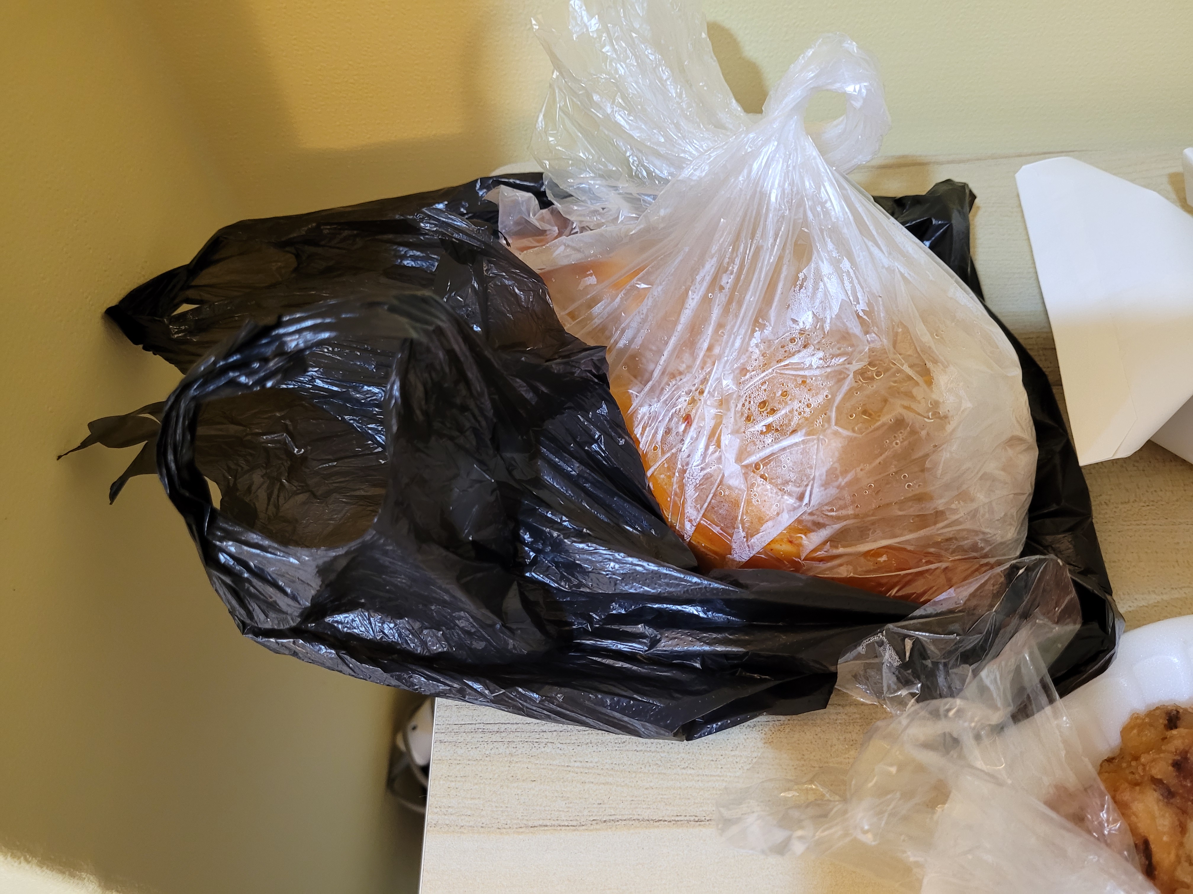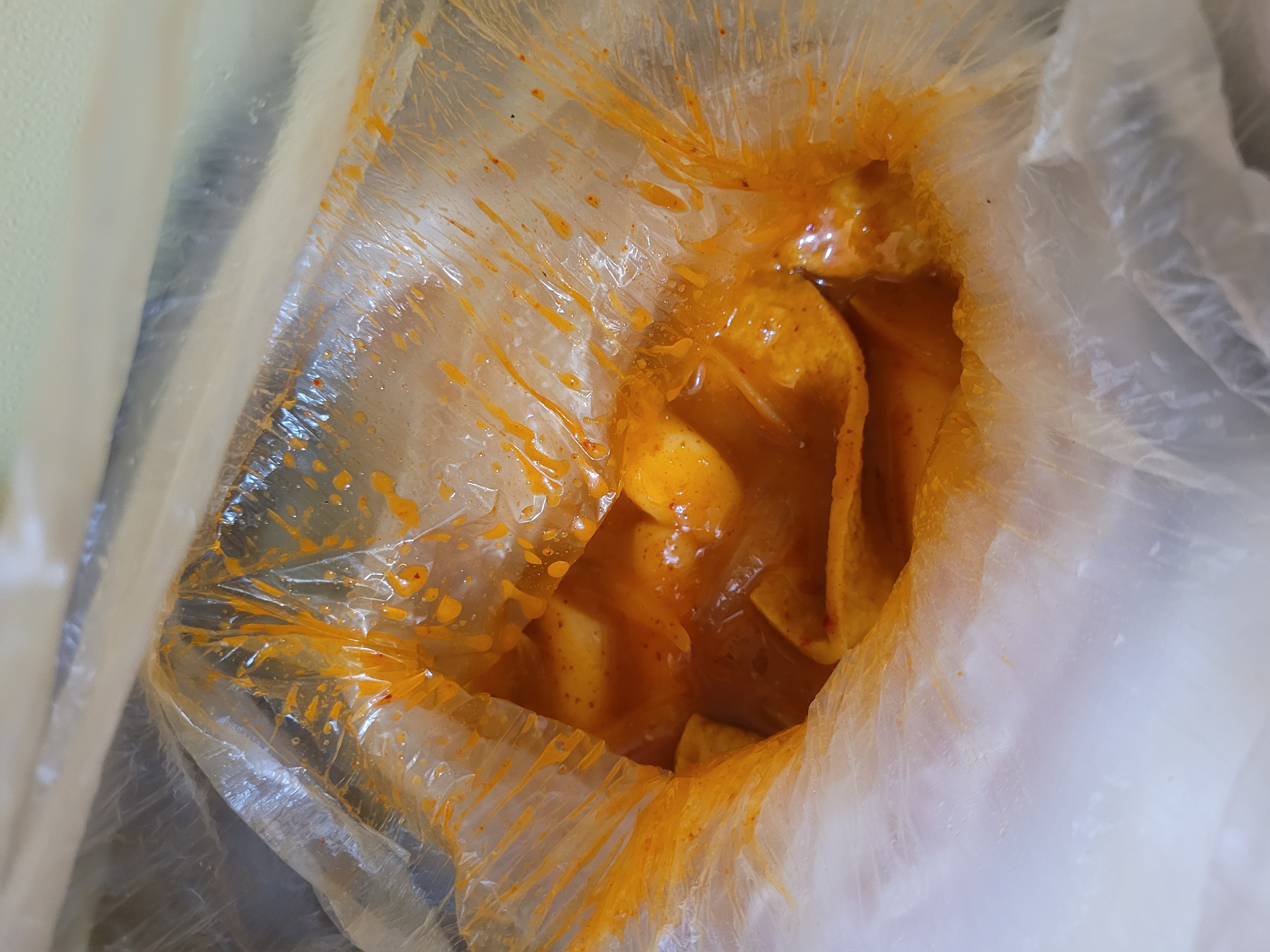 I also want the full kdrama experience here, so I order it to takeaway, and low and behold it is packaged up not in a container, but thrown straight in a plastic bag and tied up. That’s what I’m talking about.