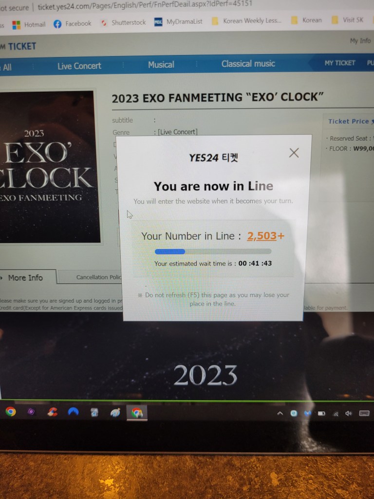 So there I sat, nerves jangling and hands literally shaking. I had followed as much online advice as I could when it comes to buying tickets like these. I joined a chat group for international fans who planned on trying for tickets to get real-time advice and support. I fake-attempted to buy a ticket for another event on the same site to see what the layout of the ordering and payment pages were like (in Korean don’t forget). I had gone through the fan club pre-sale verification process (I hate you SM Entertainment for making this so bloody complicated). And yes, you read that right, I am in the official EXO fan club and bought my membership last year specifically on the complete off-chance that an event like this might occur. I had opened numerous ticket screen tabs for Yes24 on my computer so that I could join the pre-sale queue multiple times to have a better chance at getting into the ticket site. I had pre-emptively written all my payment details on a cheat sheet on my screen to copy and paste (for faster payment). I set up my mobile phone in the one(!) location in my home where it actually gets a signal (for a payment confirmation text). And I had even gone so far as to log onto the live Yes24 server clock page (such a thing exists just for moments like this) to know the exact time the ticket site would go live and had already timed my refresh rate so I could click 4 seconds beforehand to account for my internet speed.