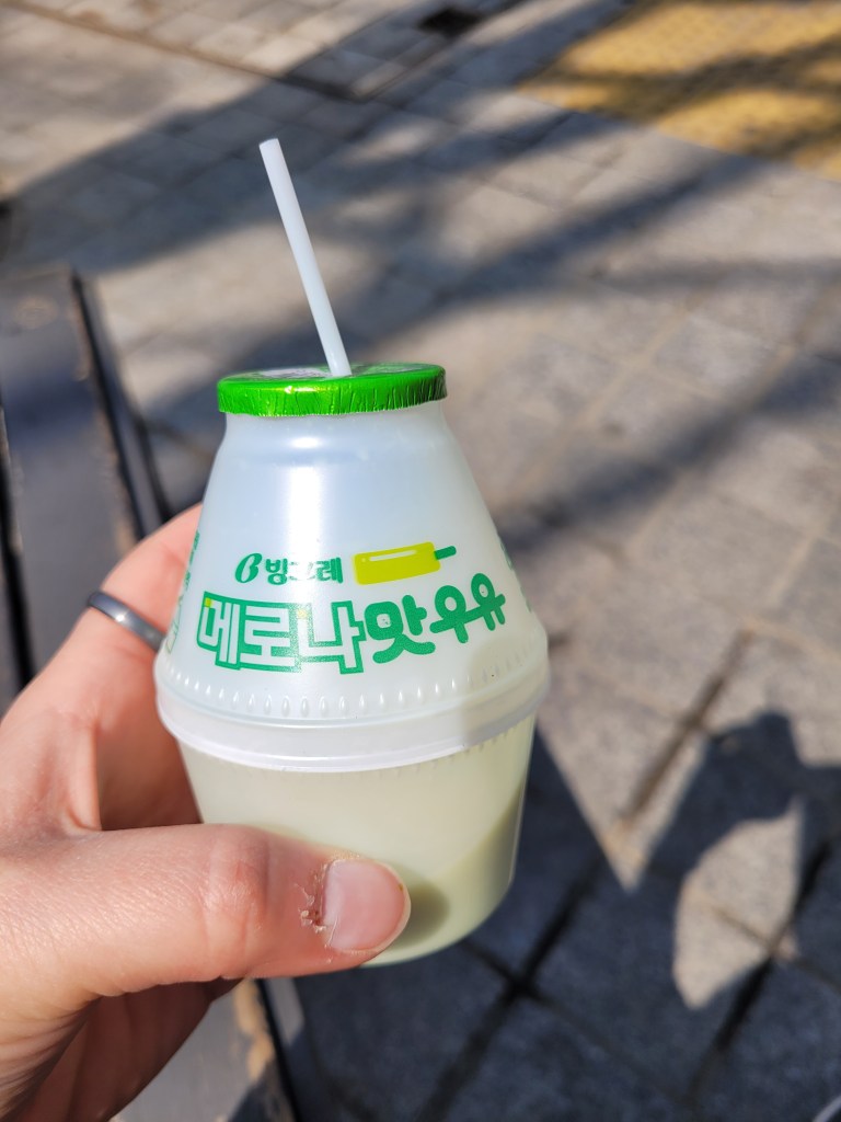 Much akin to the ‘come in the autumn, it’s lovely and cool’ sales tag, only to have sweated buckets for my first 3 weeks in Seoul, Spring is much in the same vein. I’m in a t-shirt, sunhat, sunscreen, and shades and it’s the 31st March. This would be the equivalent to mid-summer in the UK. But still, it’s a good reason to try a new milk flavour to cool down, melon this time (my tip – stick to the banana or strawberry).
